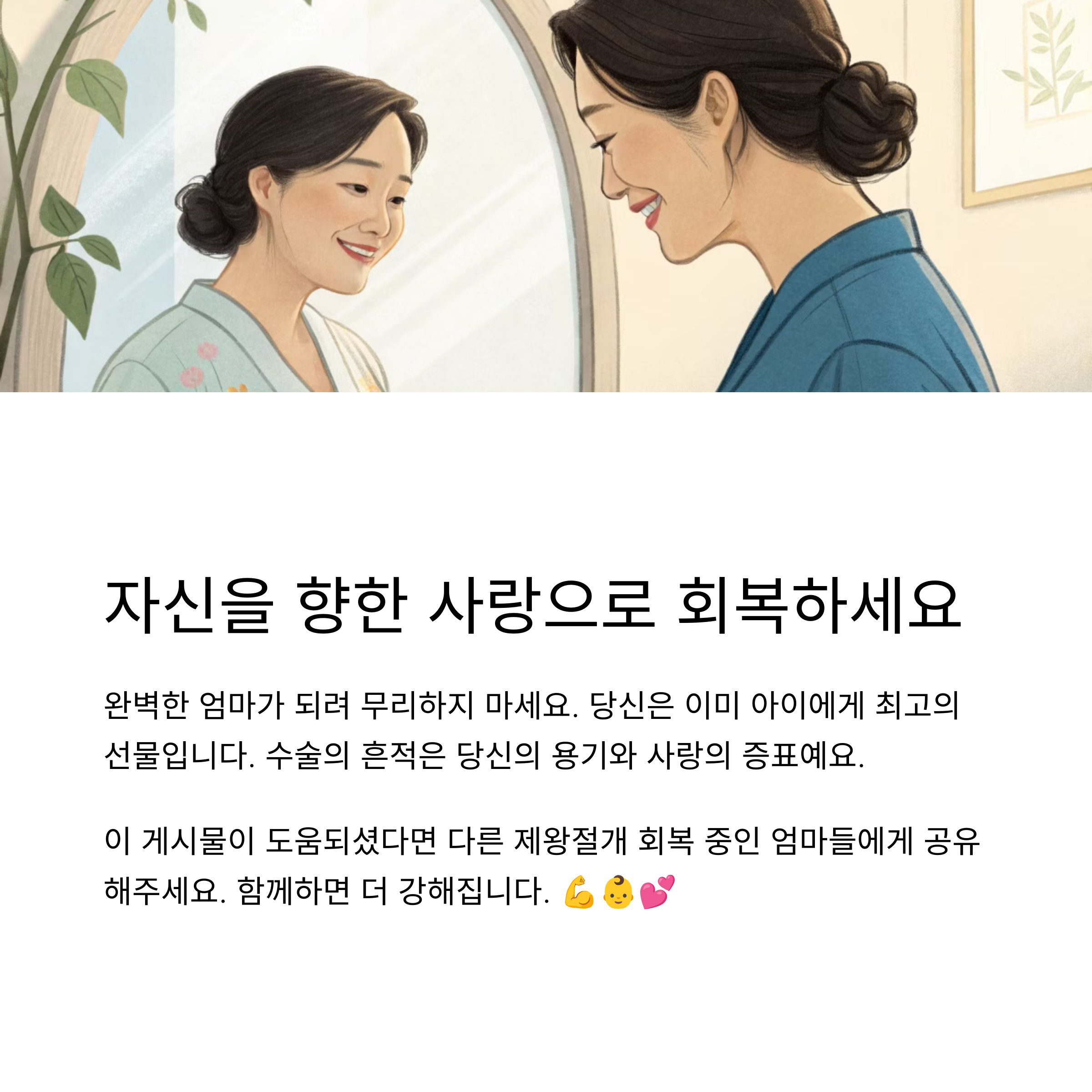 제왕절개는 누구에게나 두려운 수술일 수 있지만, 많은 엄마들이 잘 이겨내고 회복해왔습니다. 수술 자체보다도 그 이후의 관리와 마음가짐이 더 중요하다는 사실을 여러 후기들을 통해 다시금 느낄 수 있었는데요. 스스로를 돌보는 시간과 주위의 도움이 함께할 때 빠르고 건강한 회복이 가능하다는 점을 꼭 기억해주세요.