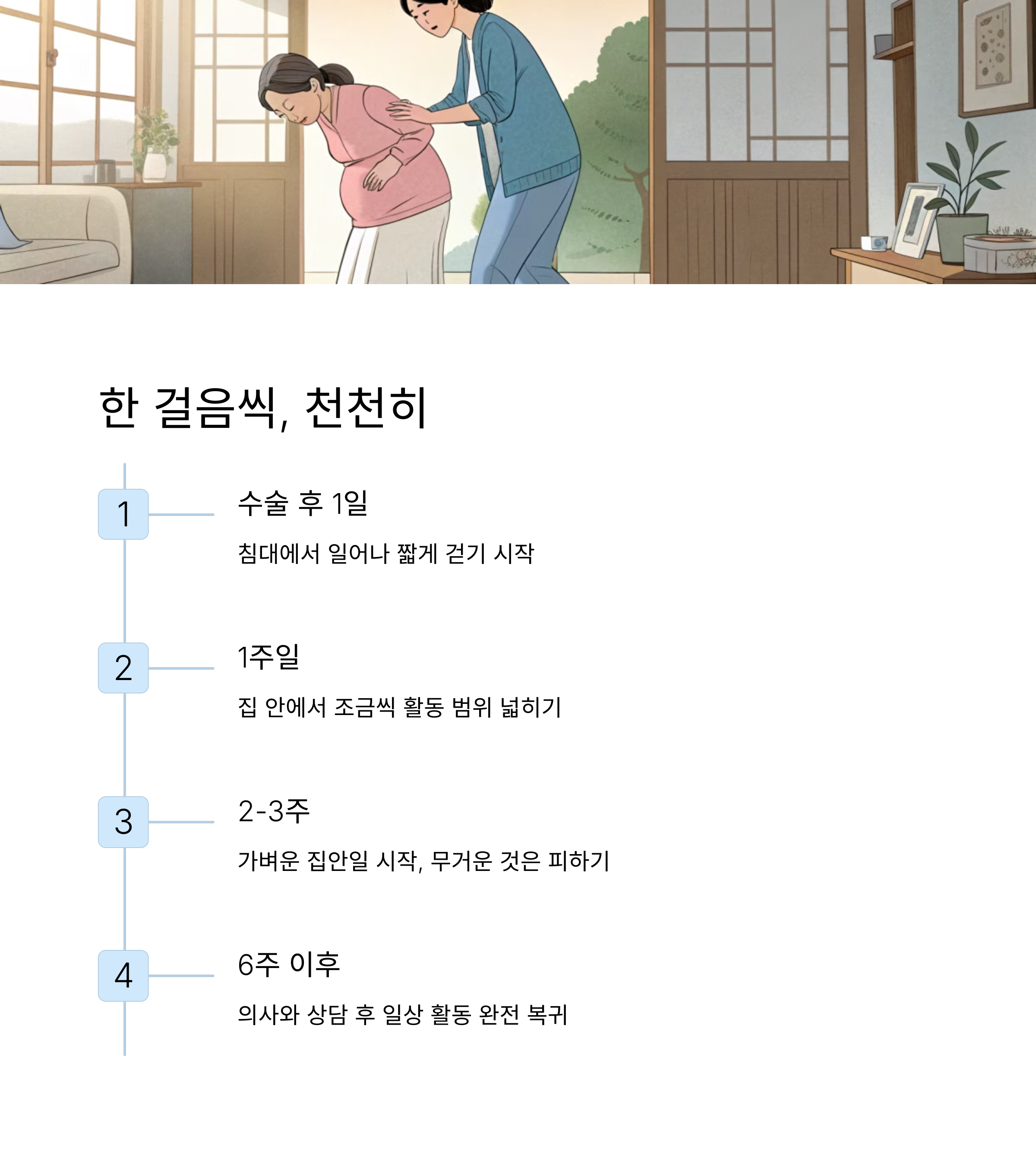 | 조기 보행 시 회복 속도 증가 | 부작용 발생 시 즉시 병원 방문 | 전문가의 산후 관리 프로그램 권장 |
