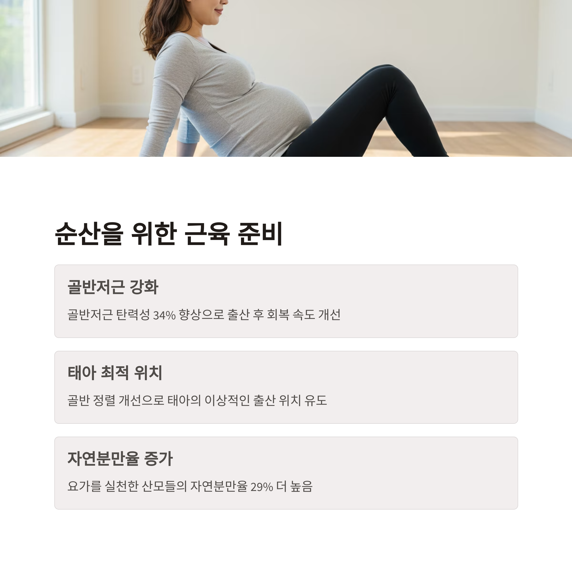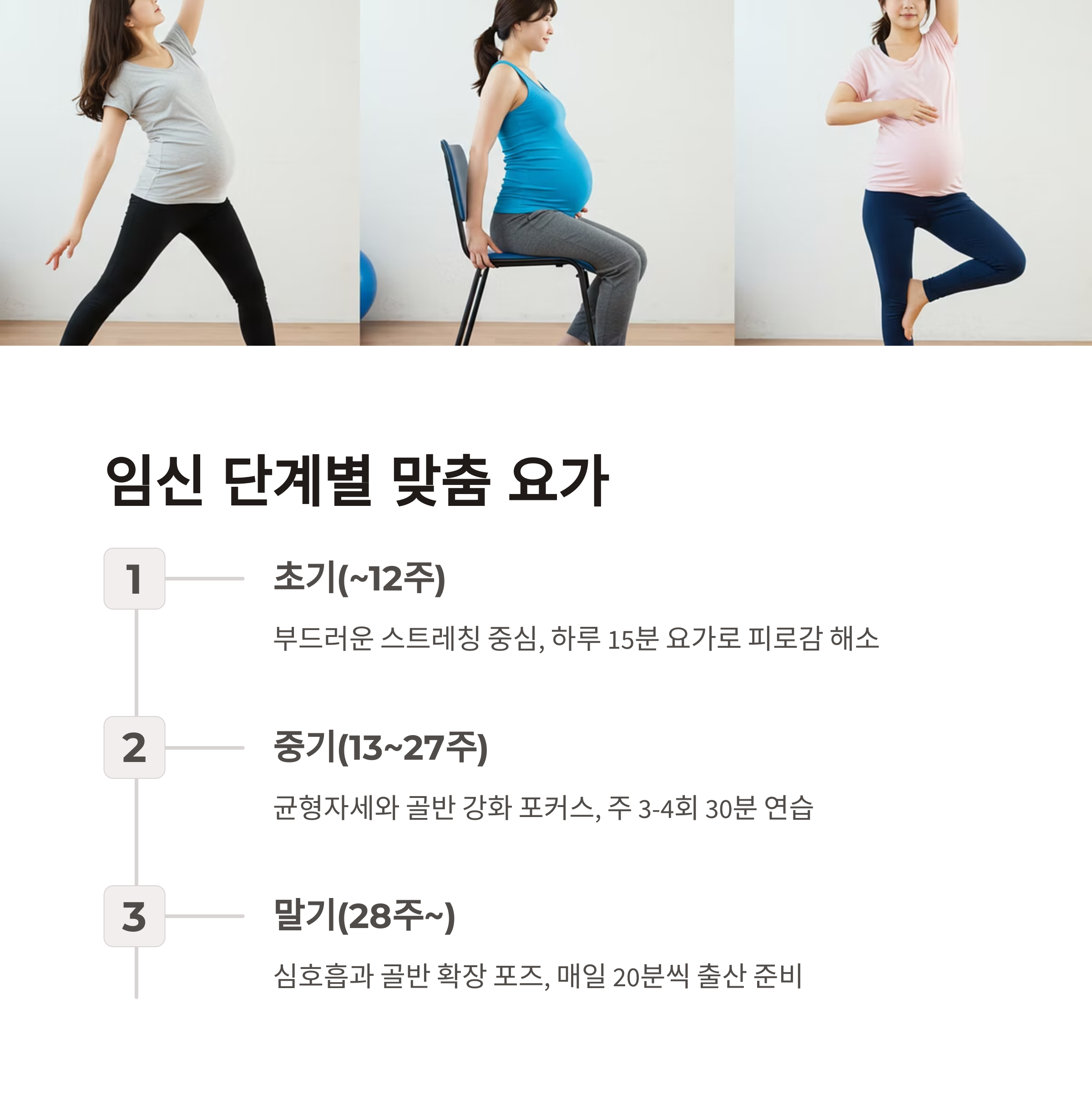 - 말기(29주 이후): 출산 준비 중심, 골반과 호흡 위주로 전환