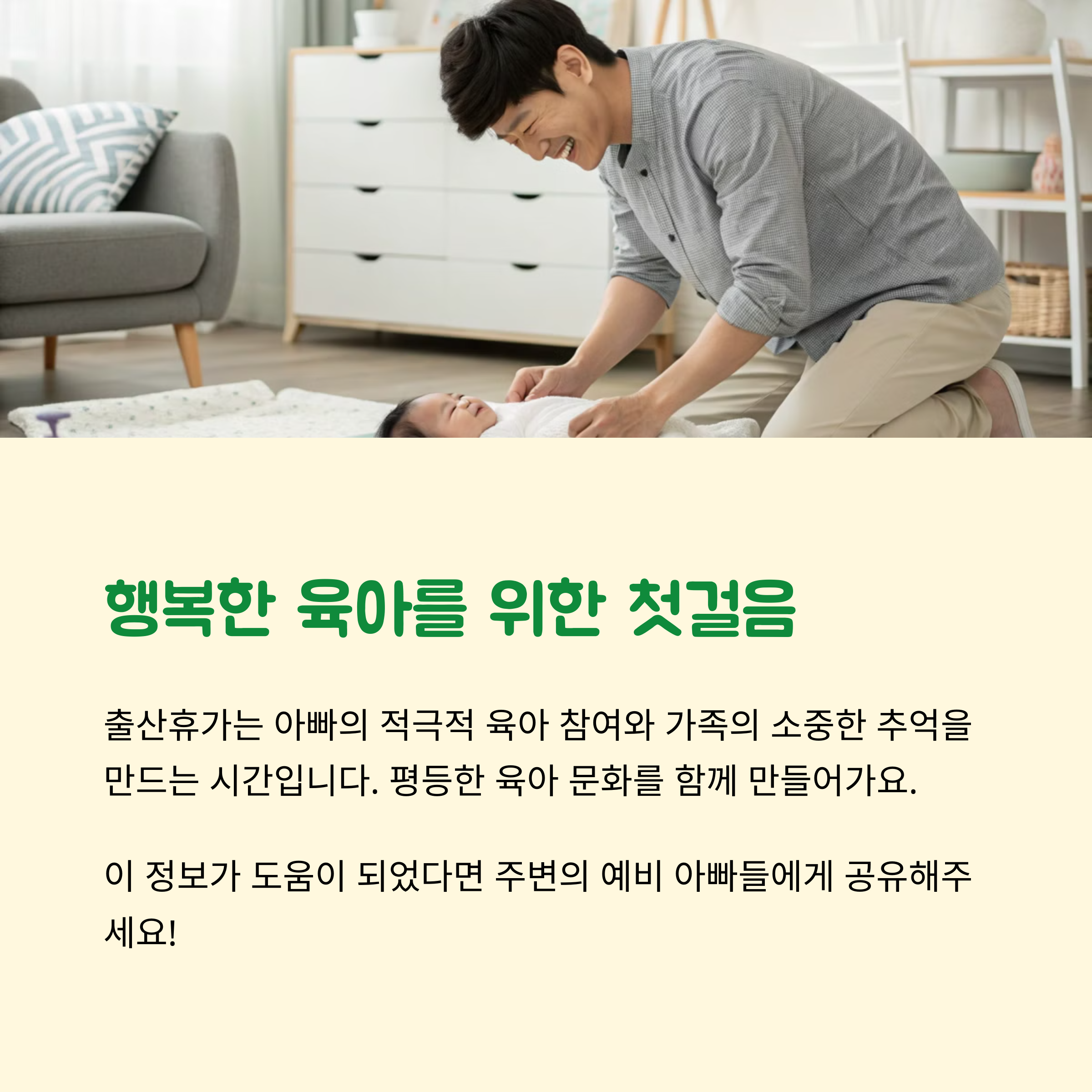 남편 출산휴가는 단순한 쉼이 아니라 가족 구성원으로서의 책임을 다하는 시작입니다. 아이와의 첫 교감은 이후 관계에 큰 영향을 미치며, 아빠가 함께하는 출산 초기 환경은 가족 전체의 유대감에도 깊은 인상을 남깁니다. 현실적인 부분은 어렵더라도 제도적 혜택을 잘 활용한다면 충분히 의미 있는 시간을 만들 수 있습니다.