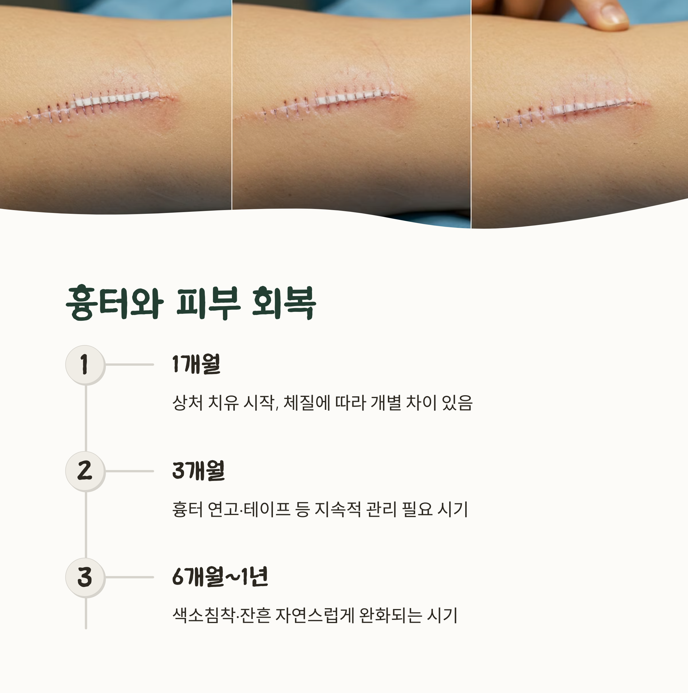 피부 절개 부위는 초기에는 붉고 튀어나오지만, 3~6개월 뒤에는 옅어지고 평평해지는 경향이 있습니다.