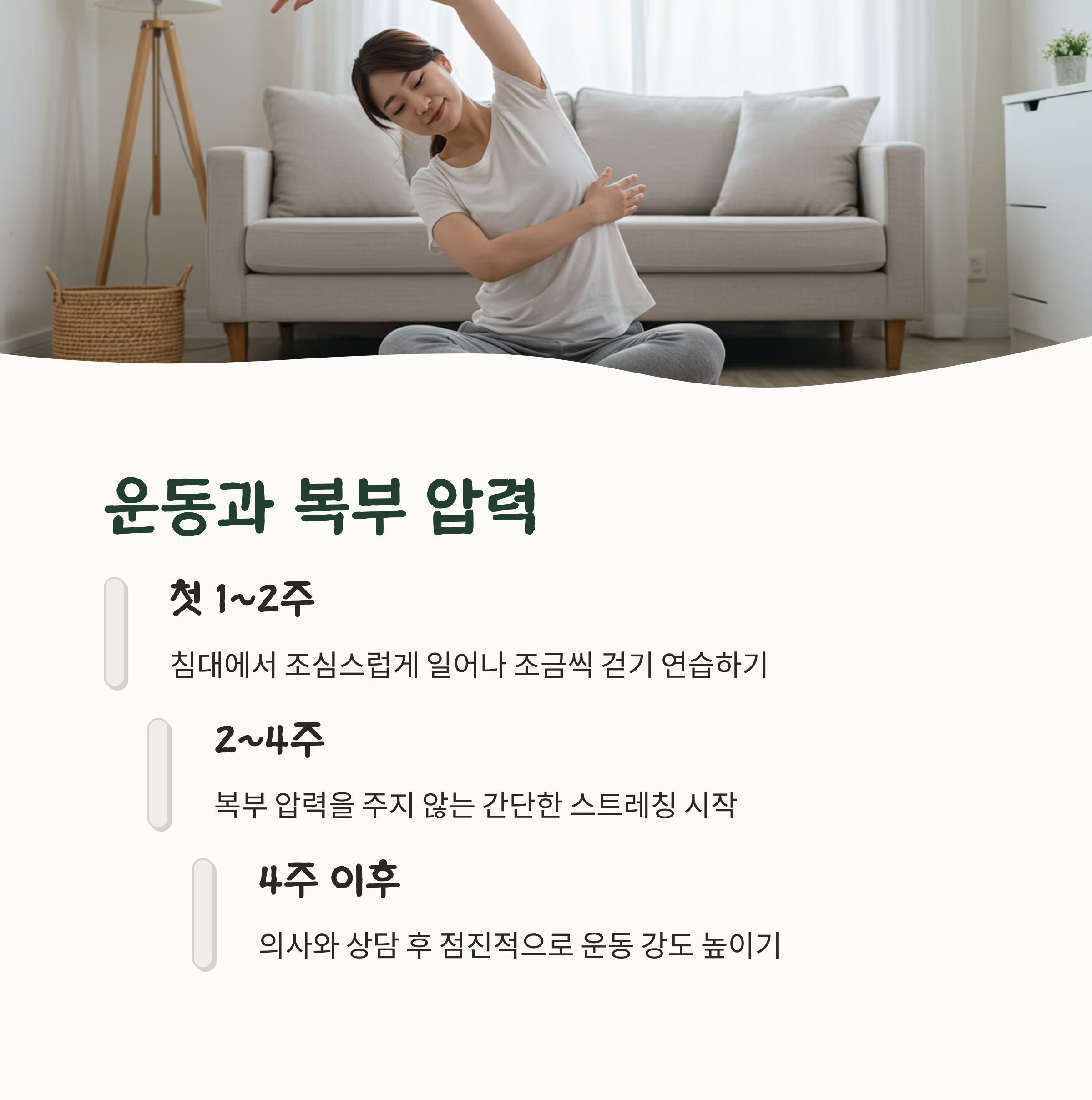 복부 코어나 유산소 운동은 최소 6주 이상 지난 후, 의사 상담 후 재개해야 합니다.