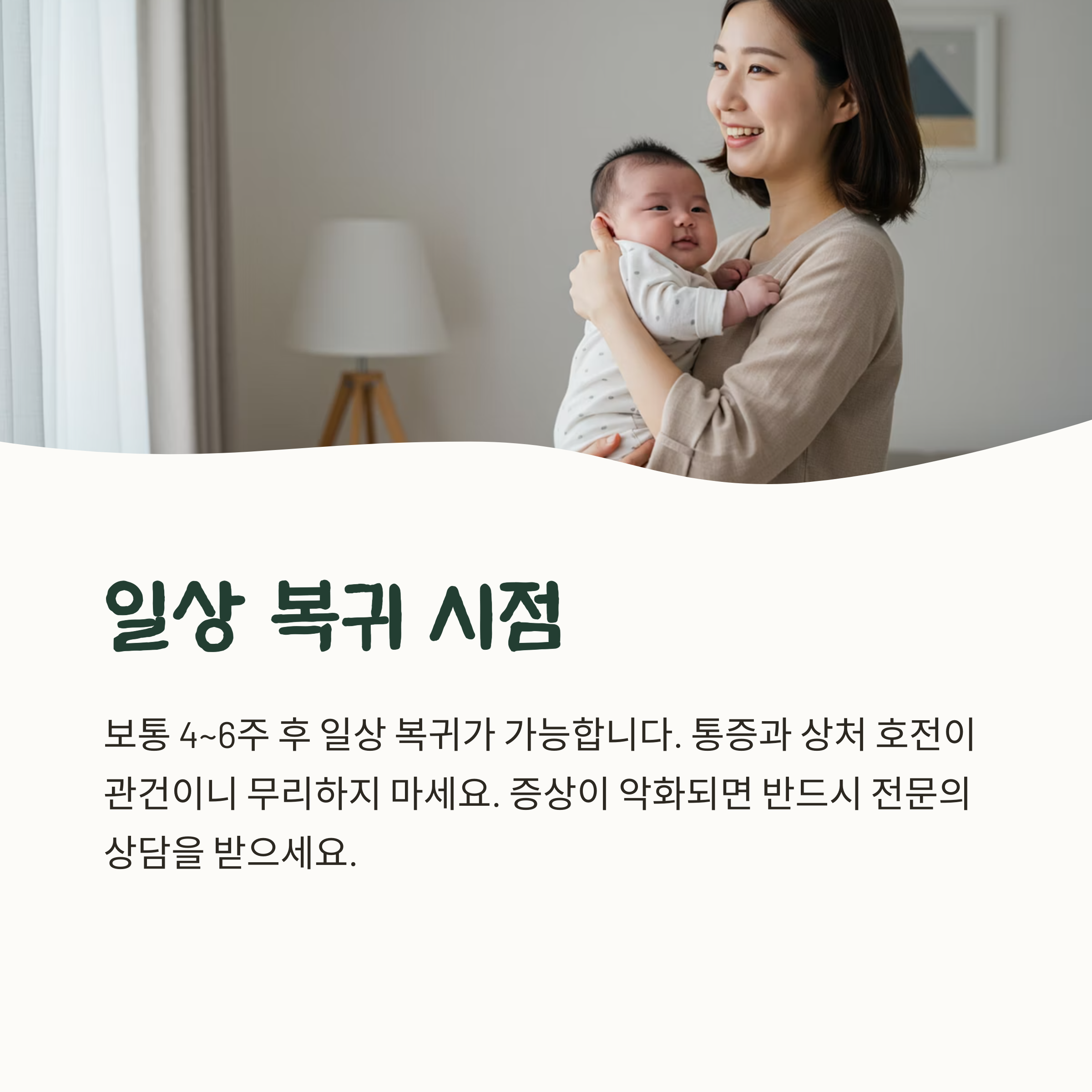 하지만 육아, 직장 복귀, 외출 등은 회복 상태와 개인 체력에 따라 달라집니다.