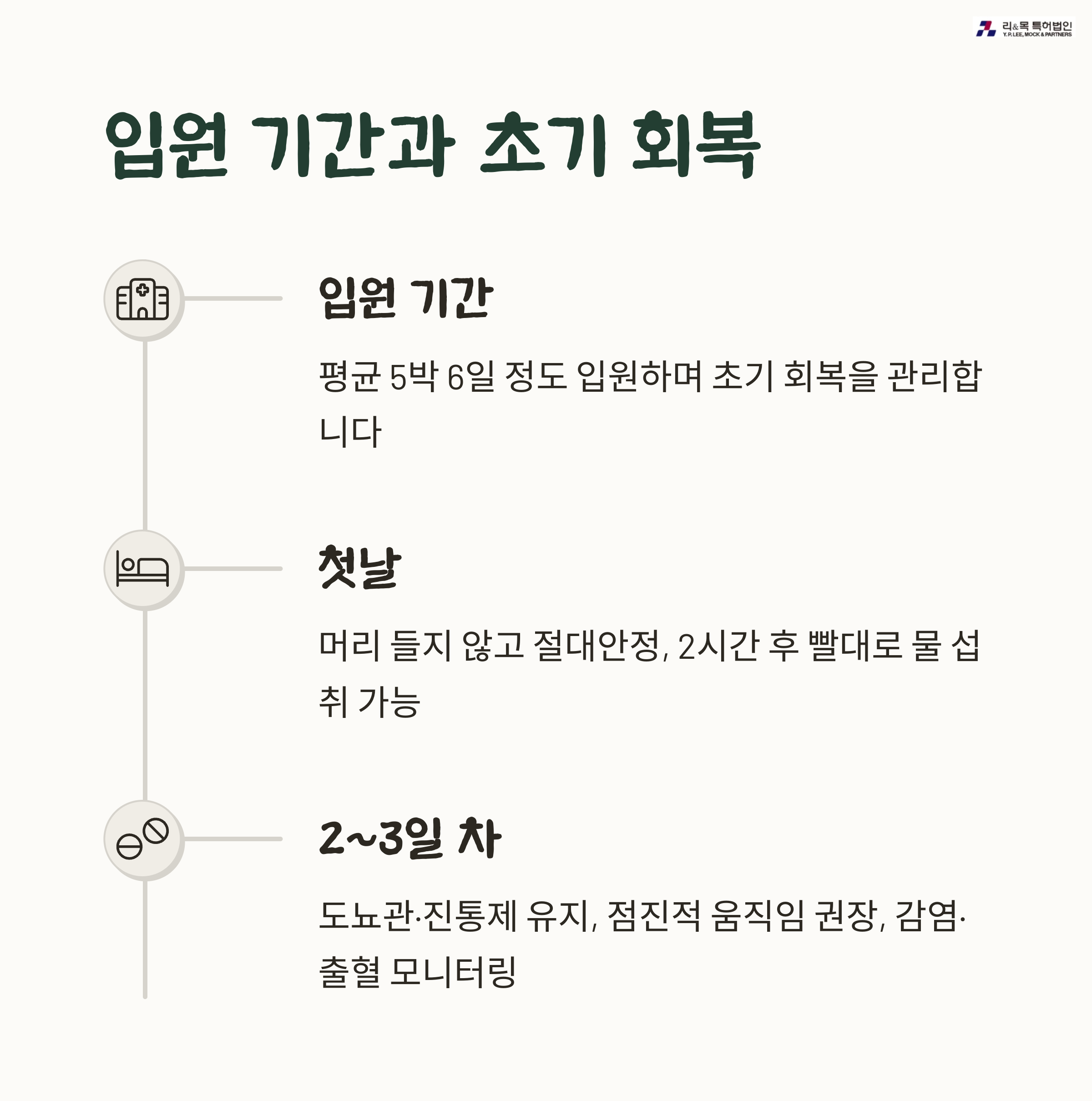 수술 직후 2박 3일에서 5박 6일 정도 병원에 입원하는 경우가 일반적입니다.