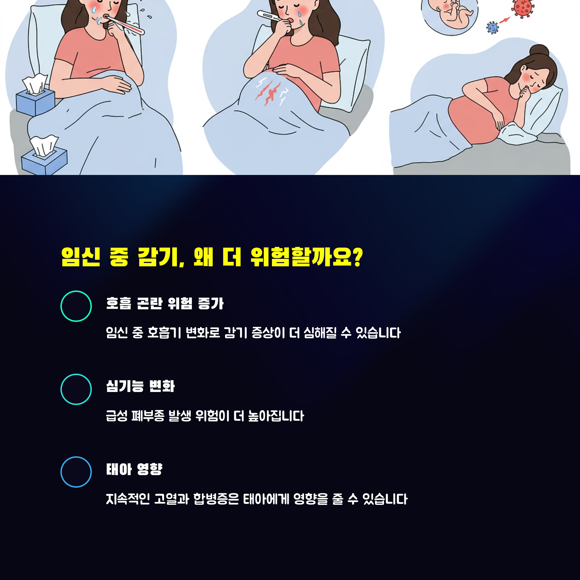 특히 고열이나 심한 기침은 태아에게도 영향을 줄 수 있기 때문에 초기부터 세심한 관리가 필요합니다.