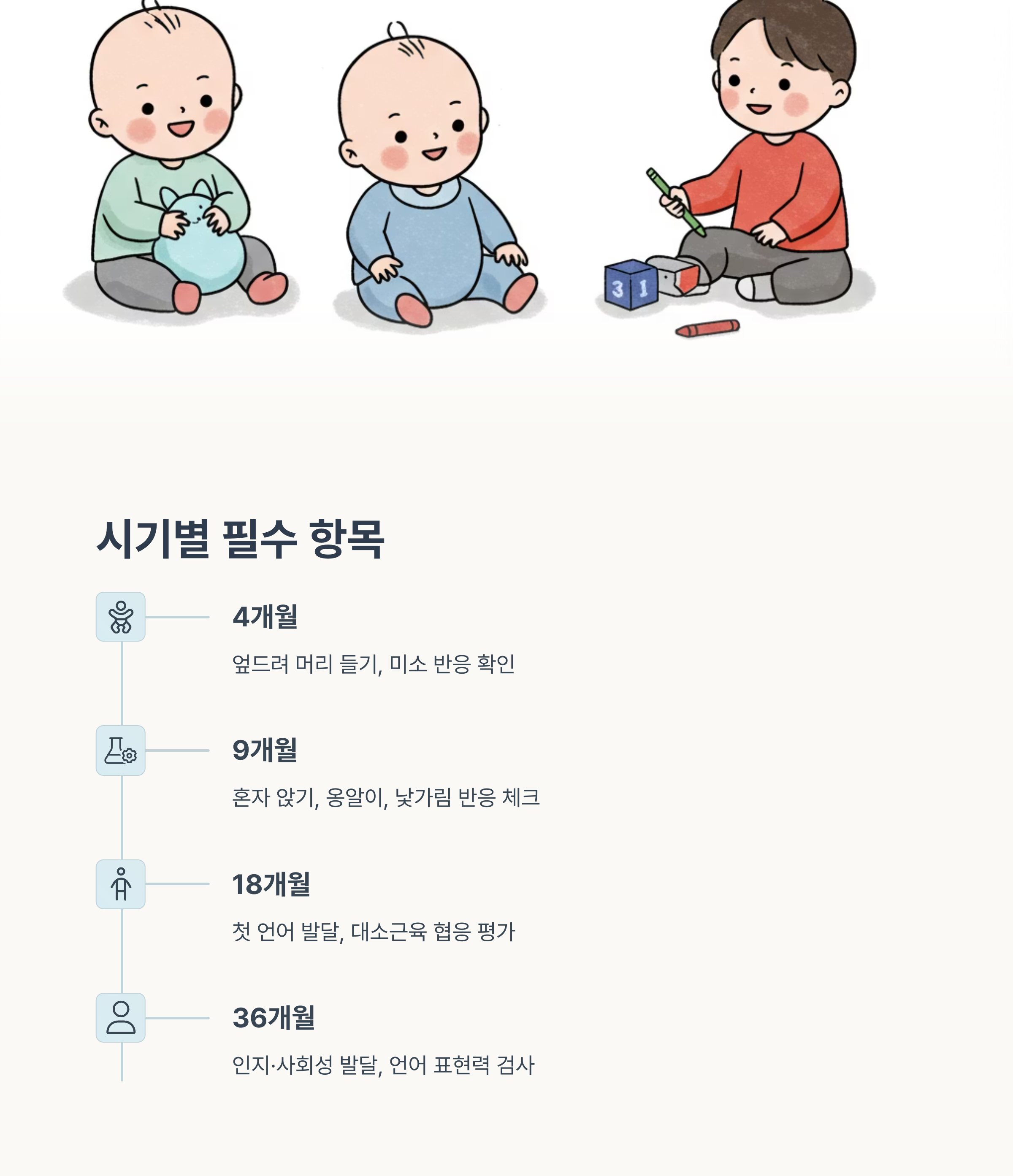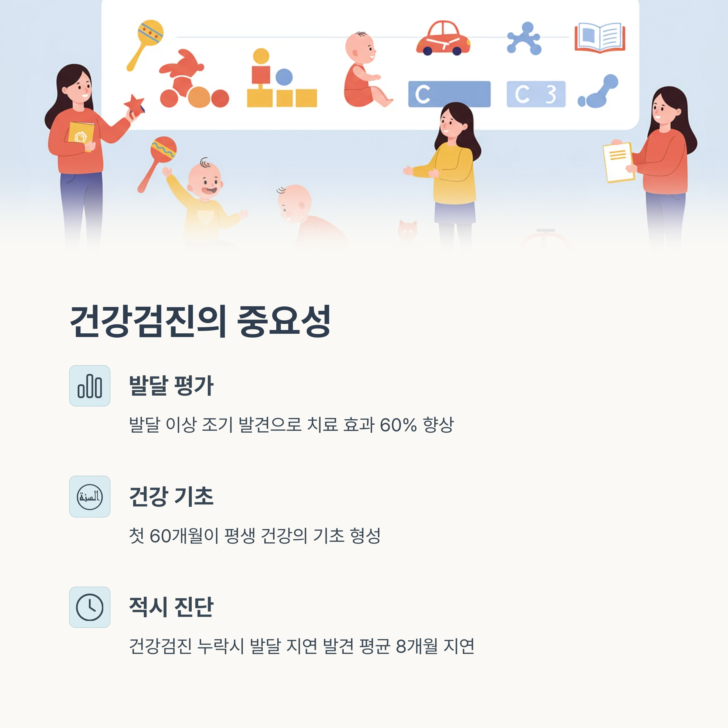 아기 건강검진은 단순한 ‘측정’이 아니라 정상 발달 여부를 조기에 확인하고 조치하는 기회입니다.