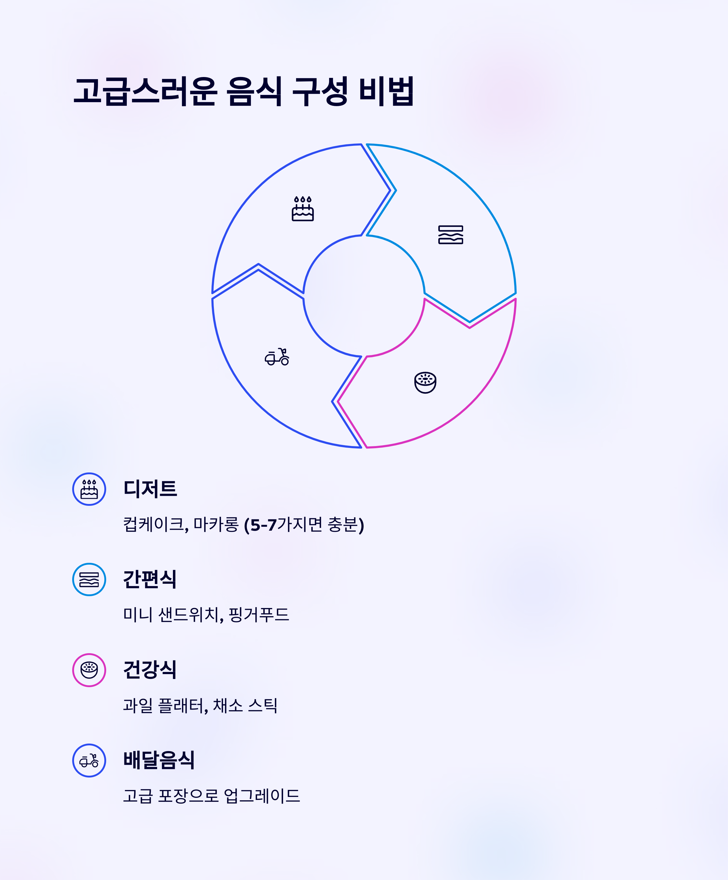| 디저트 | 컵케이크, 마카롱, 한 입 과일 꼬치 |