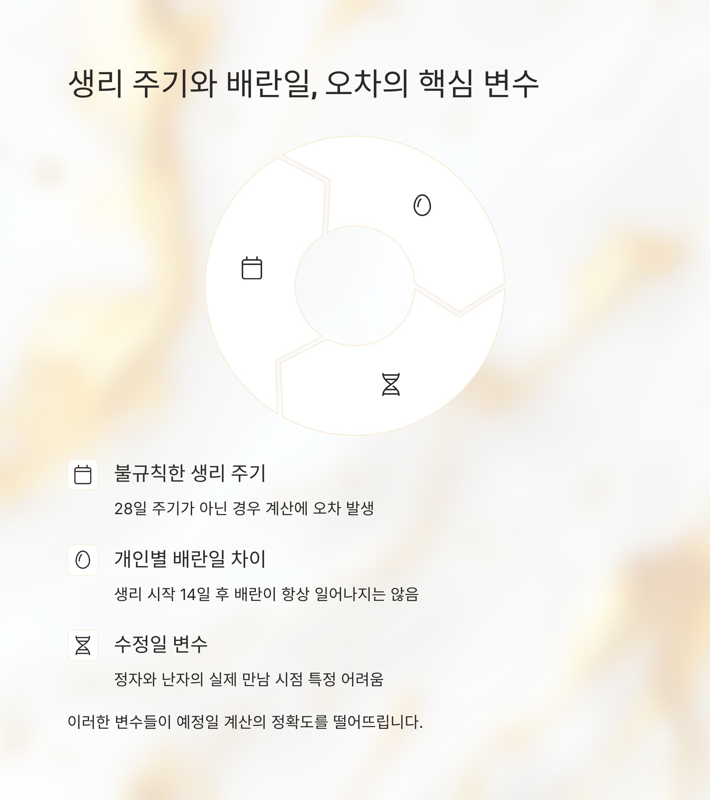 주기가 길거나 불규칙한 경우, 실제 배란일과 수정일도 달라지며 예정일에 오차가 발생합니다.