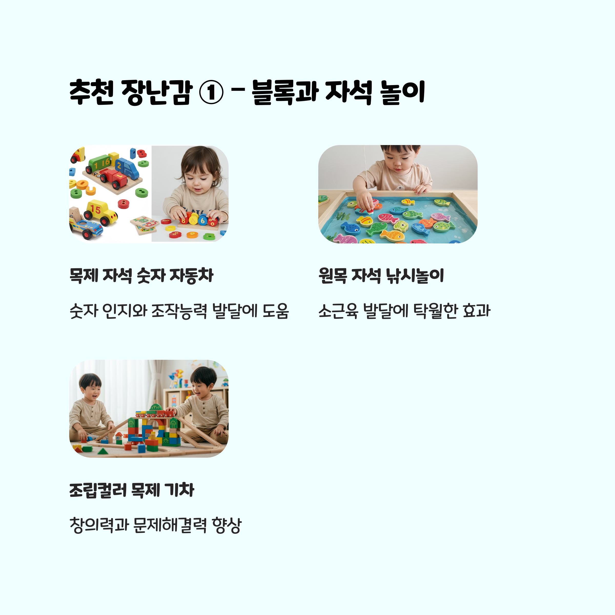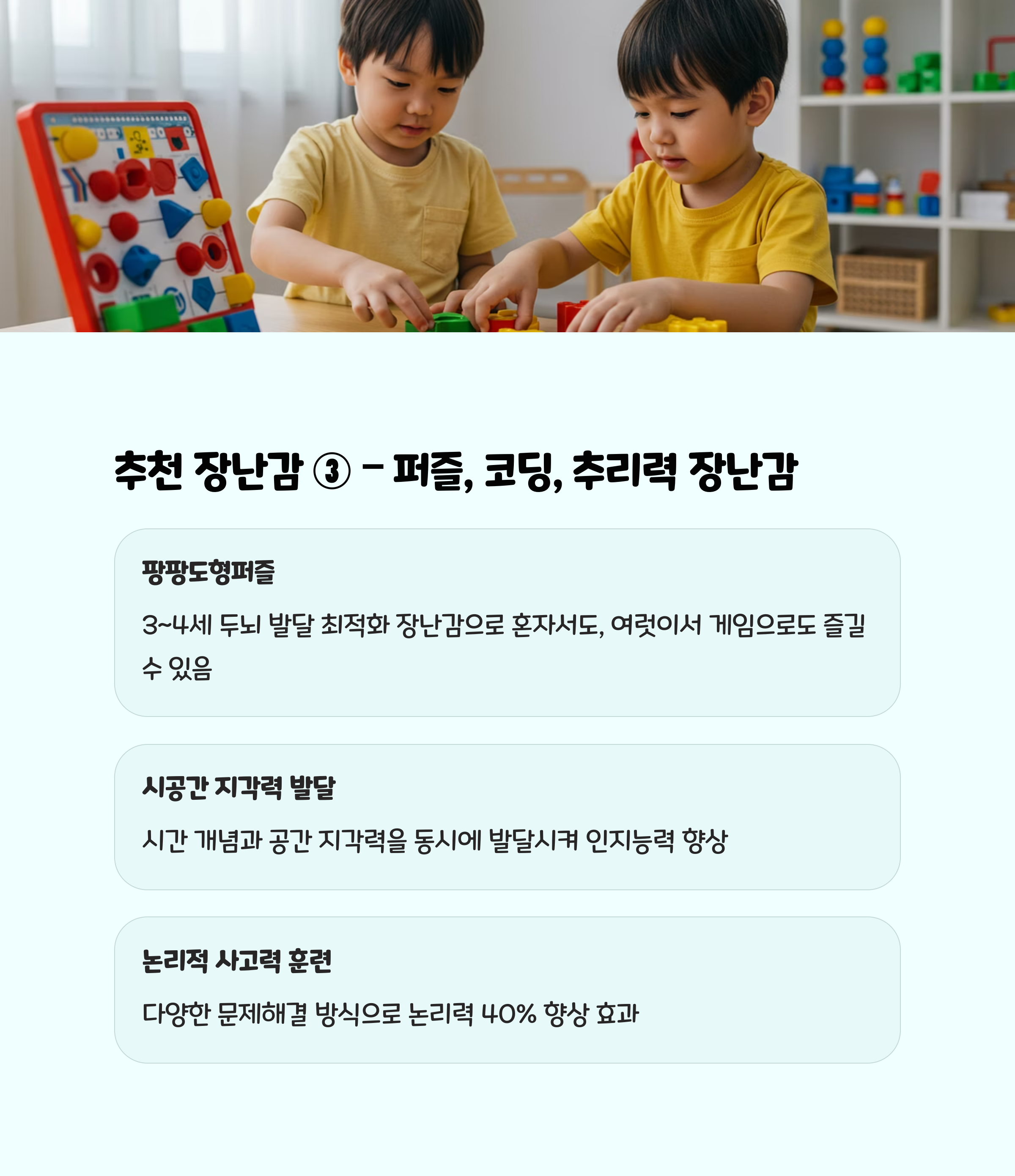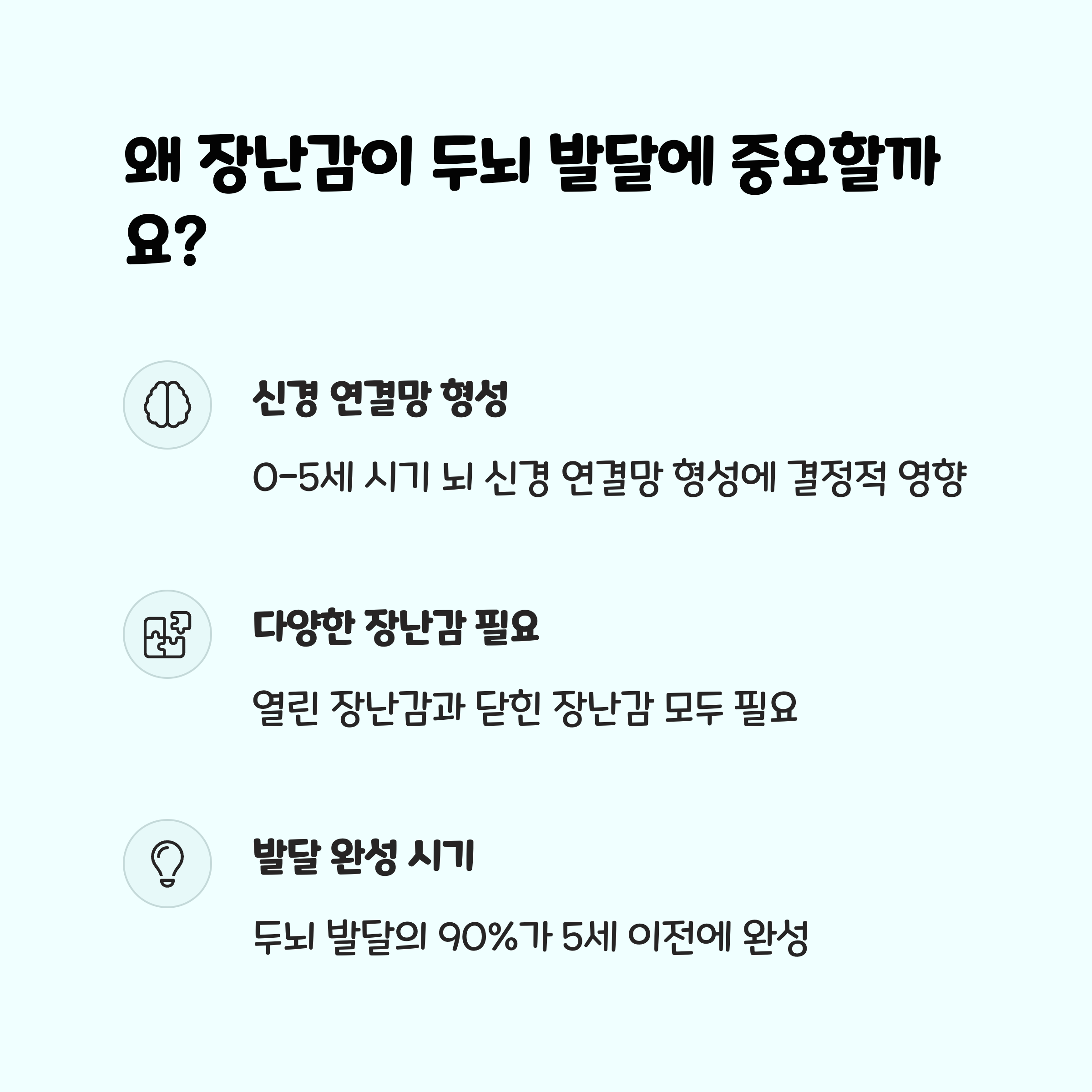 특히 논리 기반 장난감은 집중력, 인내심, 순차적 사고에 강력한 효과를 줍니다.