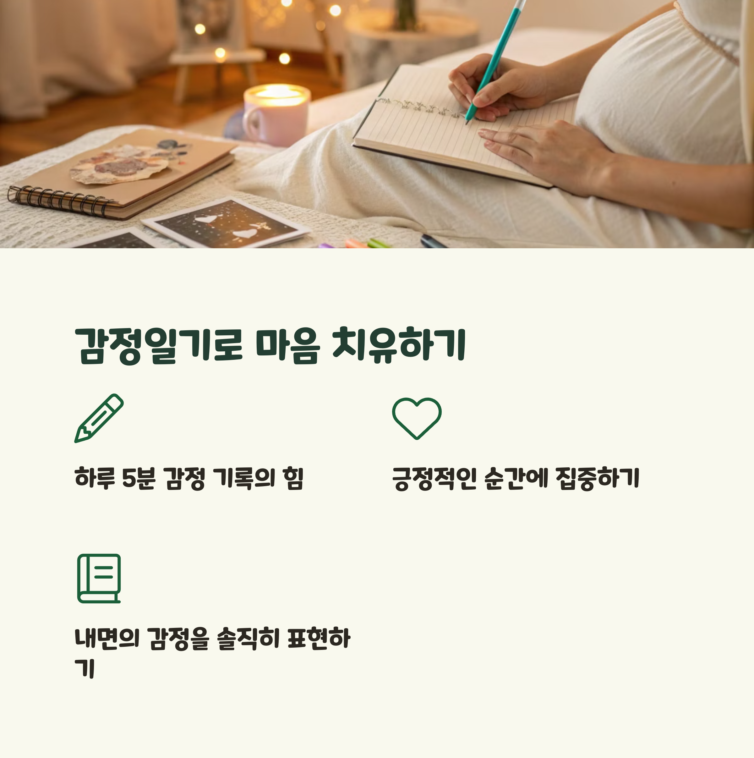 | 신체 변화, 미래 불안, 호르몬 영향 | 호흡 명상, 감정일기, 따뜻한 목욕 | 산책, 음악, 충분한 수면, 균형 잡힌 식단 |