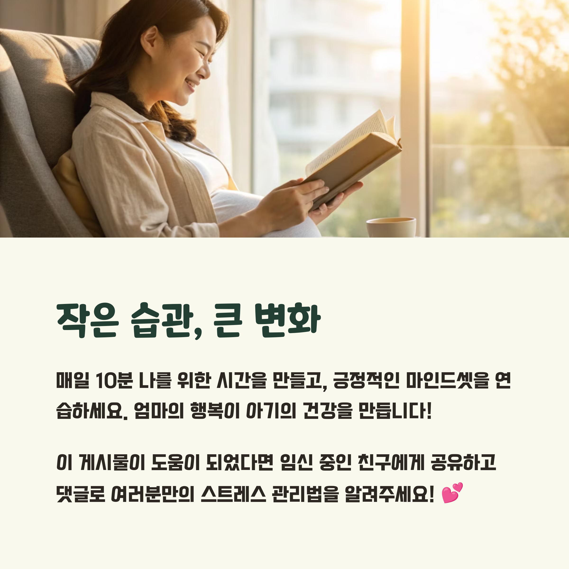 스트레스를 완벽히 제거하는 것은 불가능하지만, 일상 속에서 반복적으로 실천할 수 있는 소소한 습관들을 만들어 가는 것이 핵심입니다. 가족과의 대화, 취미 활동, 균형 잡힌 식사, 충분한 수면 등 기본적인 생활 관리가 결국 가장 큰 힘이 됩니다. 중요한 것은 자신을 아끼고 돌보는 자세이며, 이는 태아에게도 자연스럽게 전달됩니다.