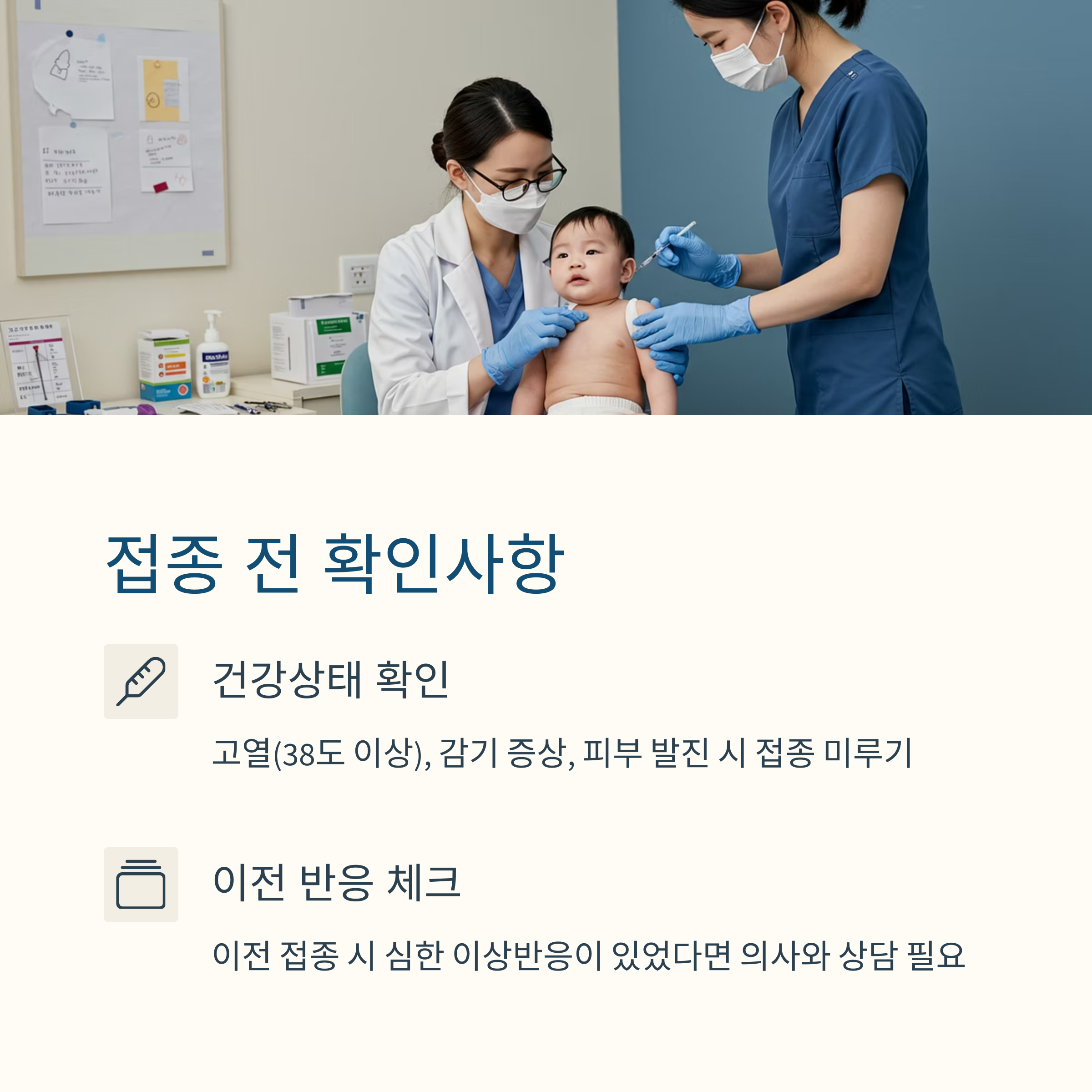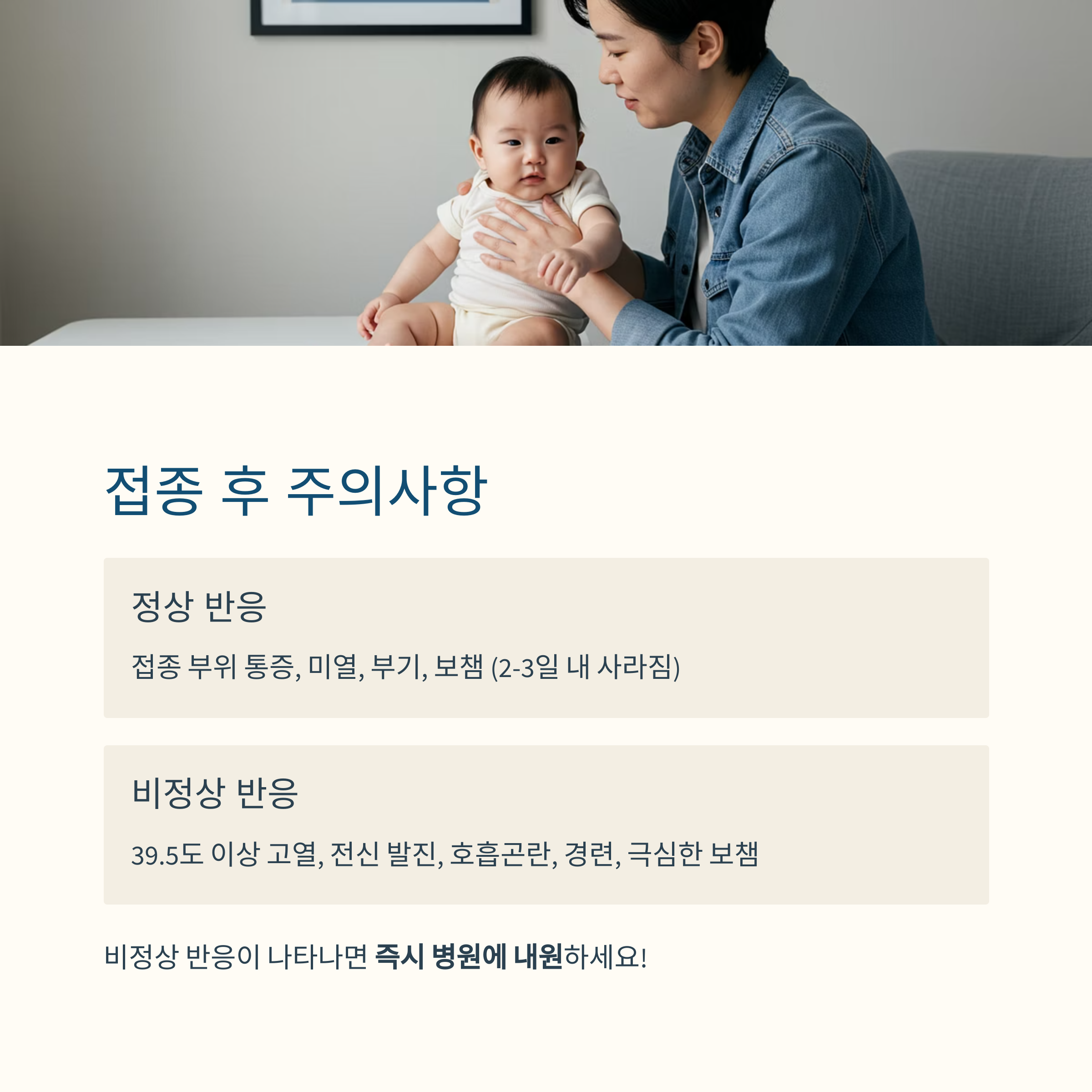 | 이후 관리 | 접종부위 청결 유지, 고열 시 해열제 복용 가능 |