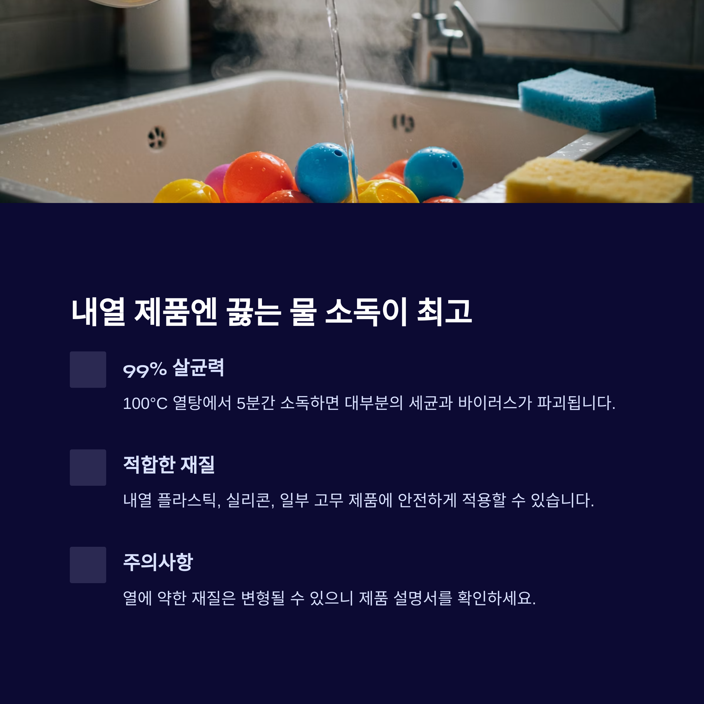 끓는 물이나 스팀 살균이 가장 효과적입니다.