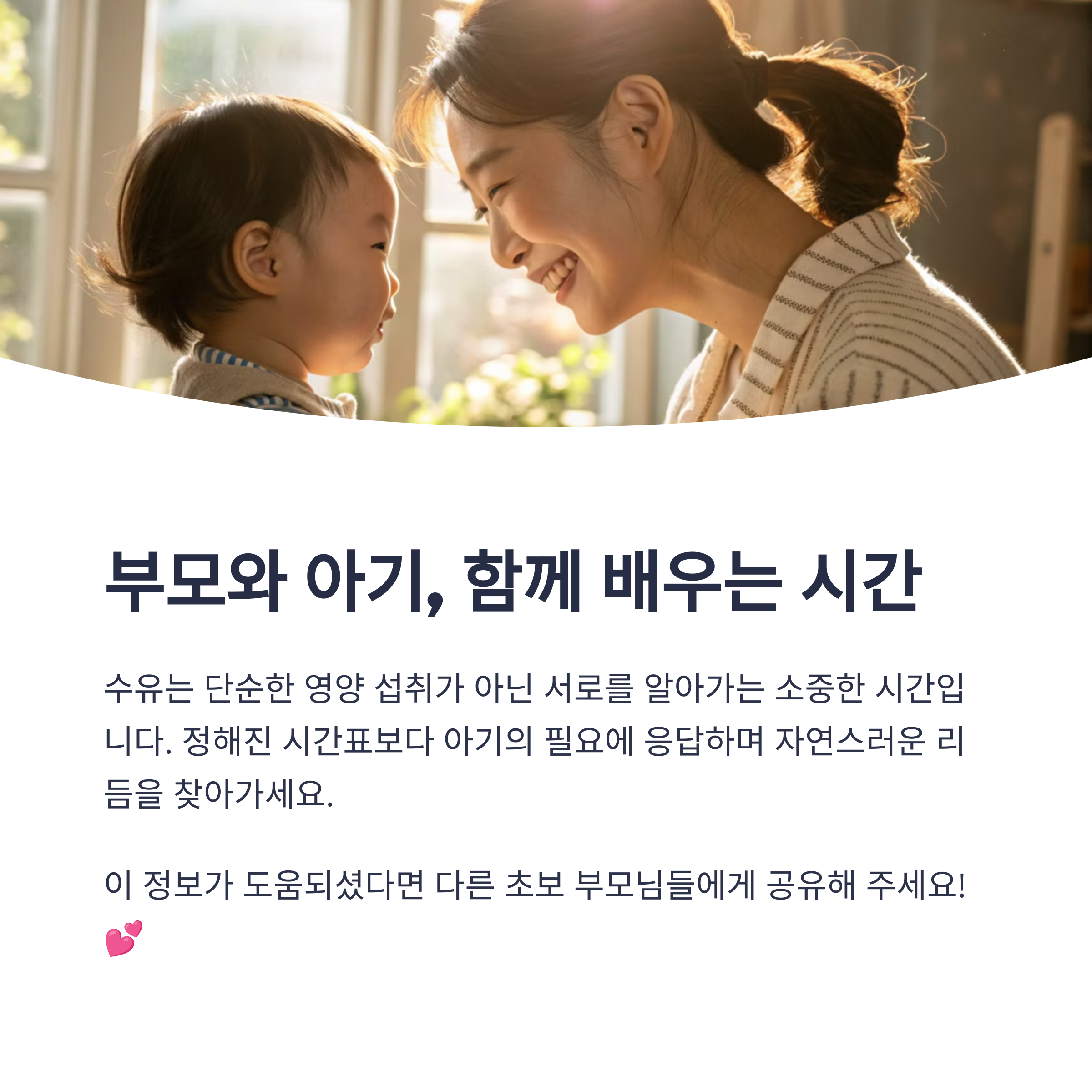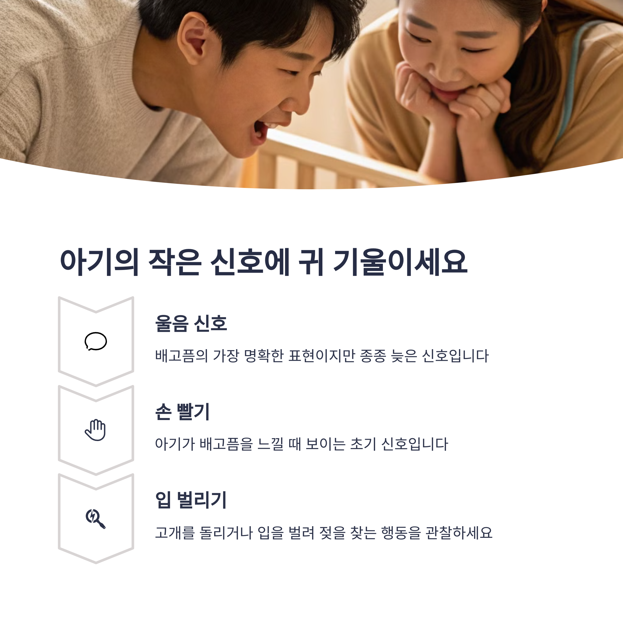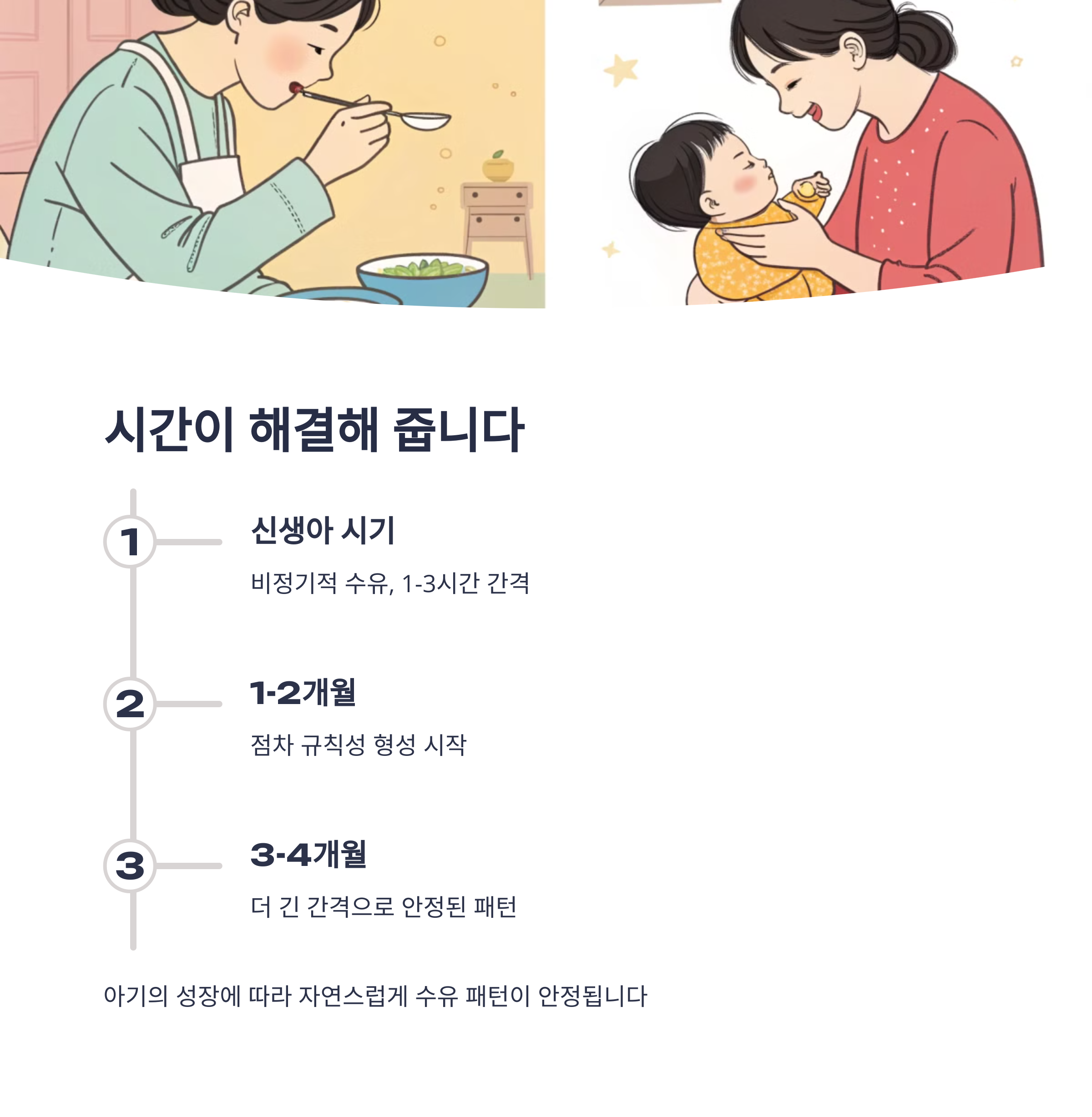| 성장에 따라 점차 패턴이 생깁니다. | 배고픔 외에도 안정을 찾으려 할 수 있어요. | 비교보다는 나만의 리듬을 찾으세요. |