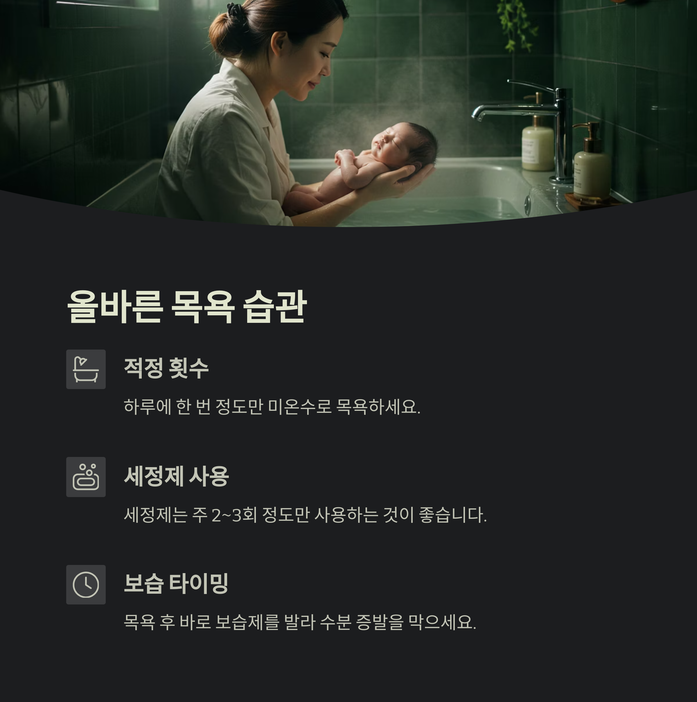 | 목욕 후 | 3분 이내 보습제 사용 | 수분 날아가기 전 유지 |