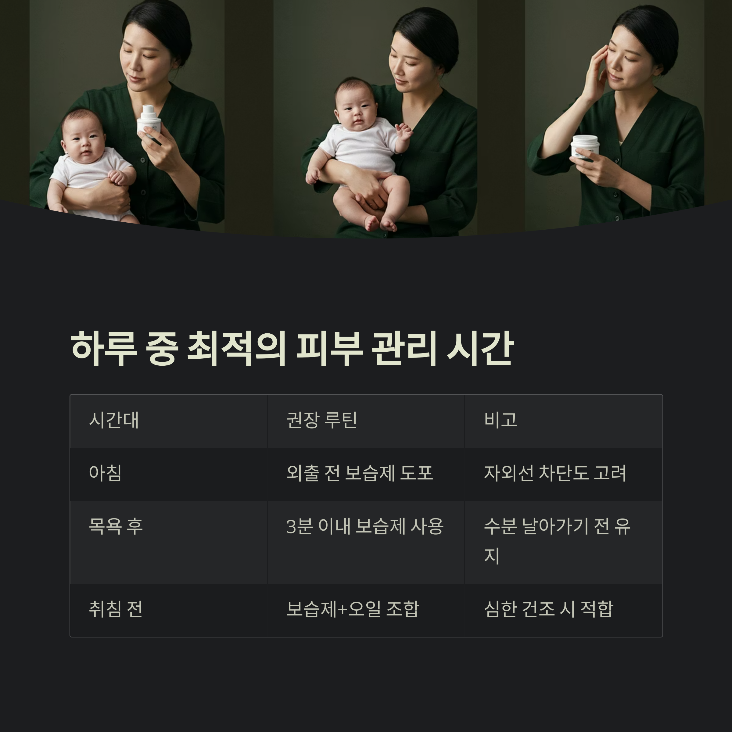 | 아침 | 외출 전 보습제 도포 | 자외선 차단도 고려 |