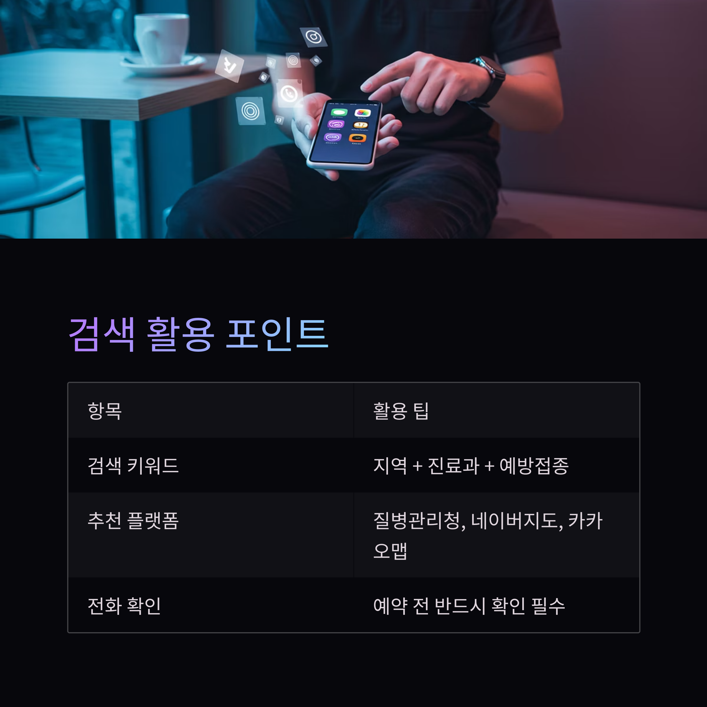 | 추천 플랫폼 | 질병관리청, 네이버지도, 카카오맵 |