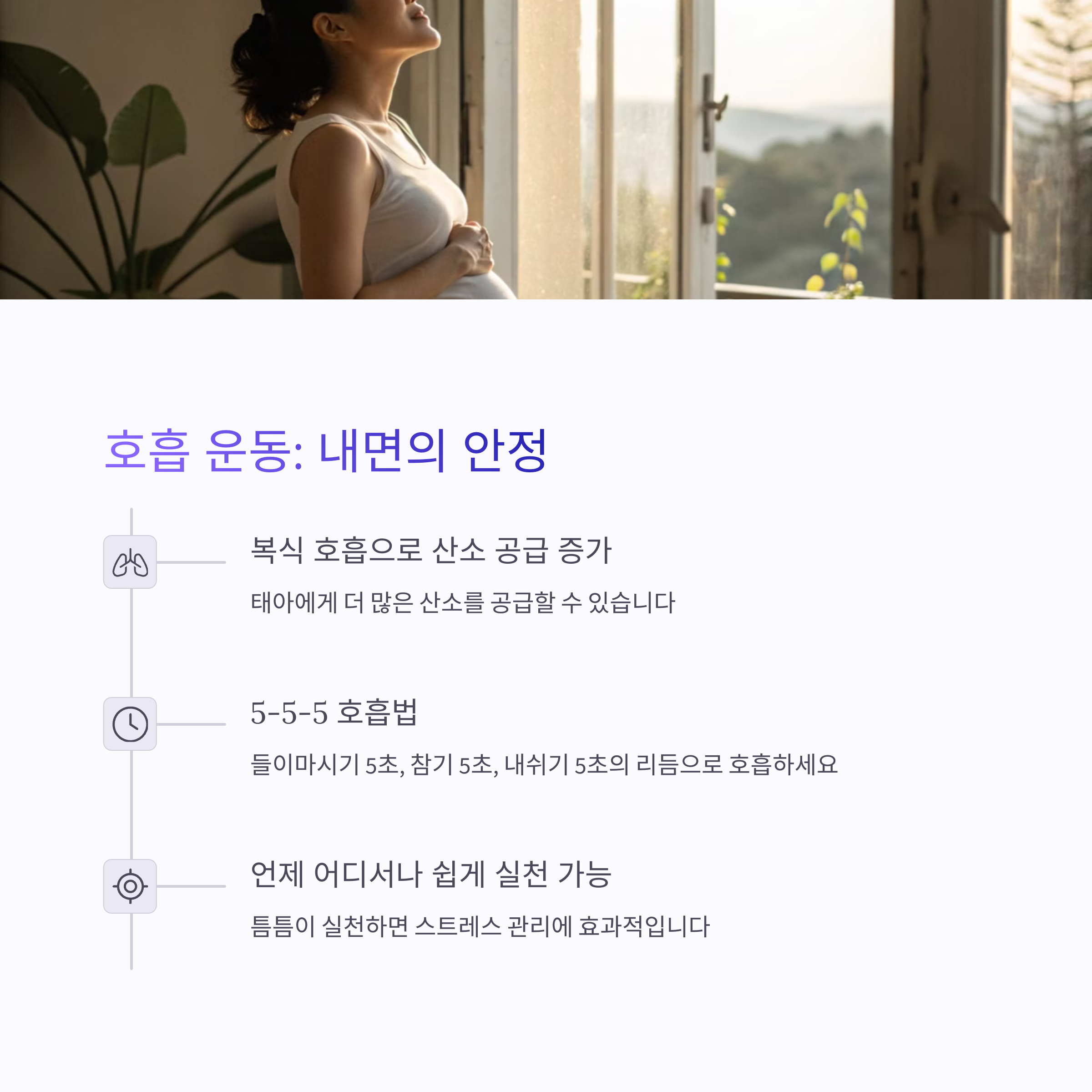 특히 명상이나 호흡법은 즉각적인 스트레스 완화에 효과적입니다. 하루 5~10분 정도만 조용한 공간에서 눈을 감고 깊은 호흡을 해보세요. 들숨과 날숨에 집중하며 ‘괜찮아’, ‘나는 잘하고 있어’ 같은 긍정적인 말을 머릿속으로 되새기면 내면의 평화를 느낄 수 있습니다. 정신적 안정감은 태아에게도 긍정적인 영향을 준다는 연구 결과가 많기 때문에 꾸준한 실천이 중요합니다.