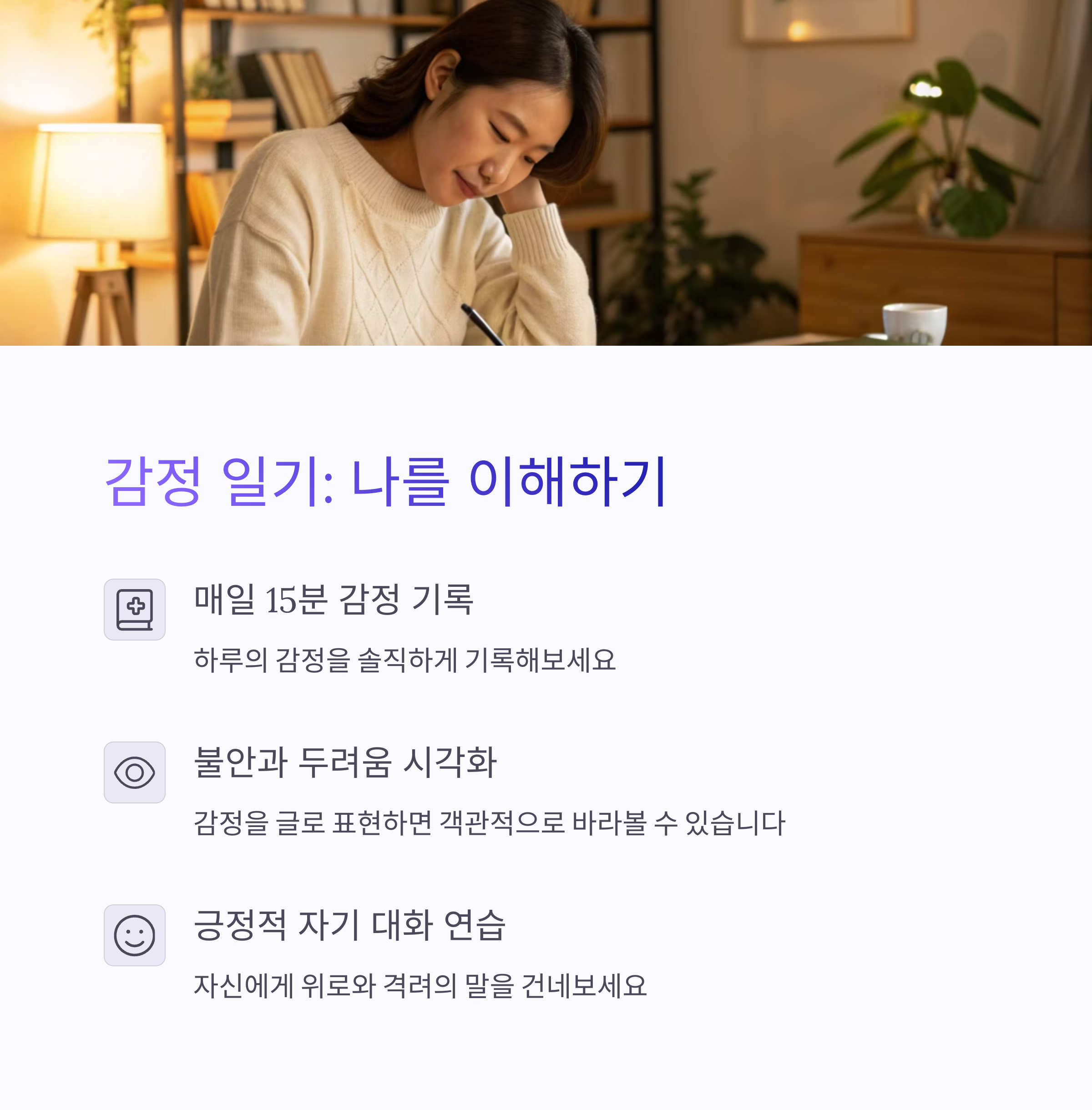 | 불안, 짜증, 피로감 등 감정 기복 완화 | 명상, 호흡, 음악으로 마음을 진정 | 자기 감정 관찰 및 기록하기 습관화 |