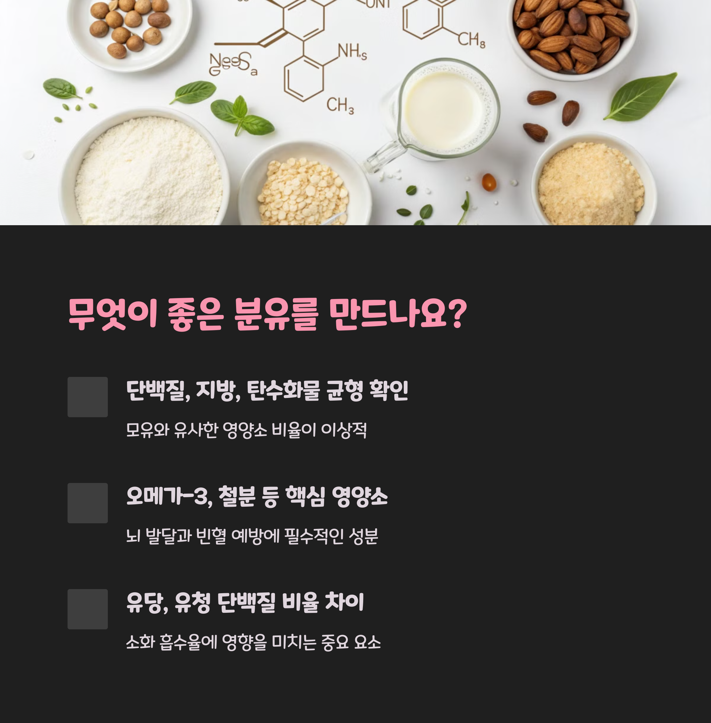 | 분유 성분 | 단백질, 지방, 비타민 등 영양 밸런스가 핵심 |