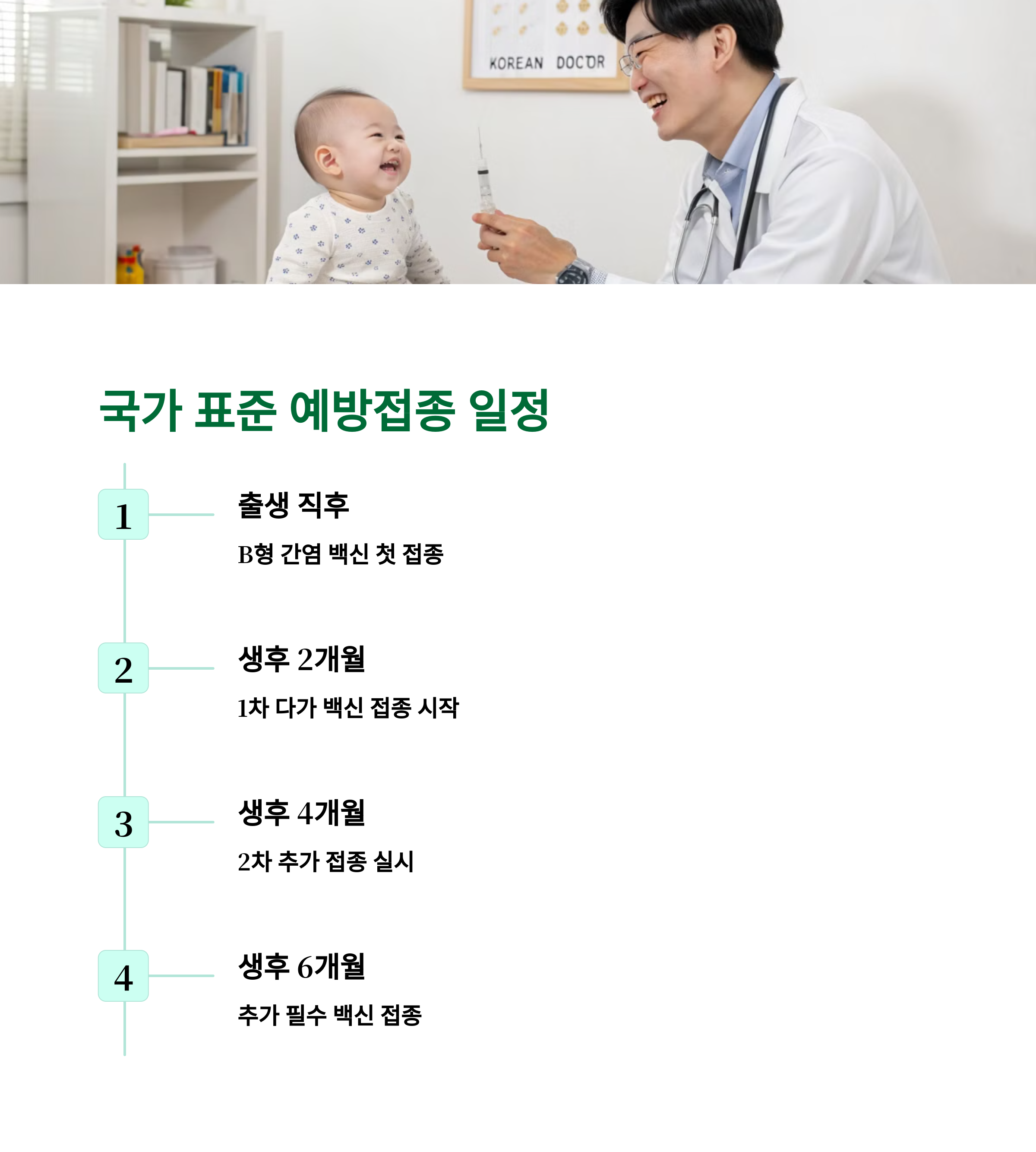 | BCG, B형간염, DTaP 1차, 폴리오 등 접종 | DTaP 3차, 소아폐렴구균, 인플루엔자 등 | MMR, 일본뇌염, 수두, A형간염 등 필수 접종 |