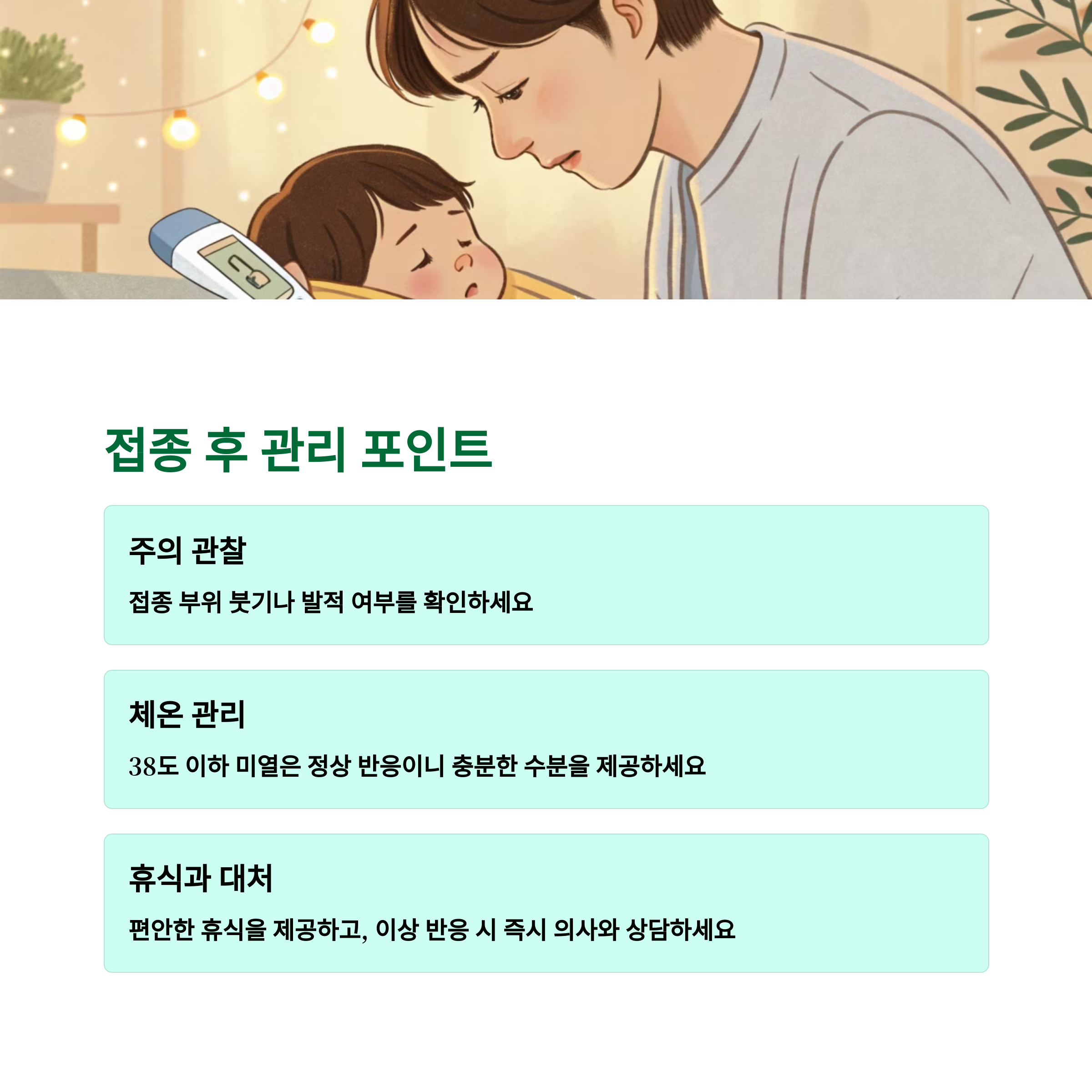 예방접종 후에는 아이의 상태를 유심히 살펴야 합니다. 발열, 부기, 통증 등 경미한 증상은 대부분 수일 내 자연 회복되지만, 고열이나 발작 같은 이상 반응이 나타날 경우 즉시 의료기관을 방문해야 합니다. 또한 접종 전에는 반드시 아이의 건강 상태를 확인하고, 감기나 열감기 증상이 있는 경우에는 접종을 미루는 것이 안전합니다.