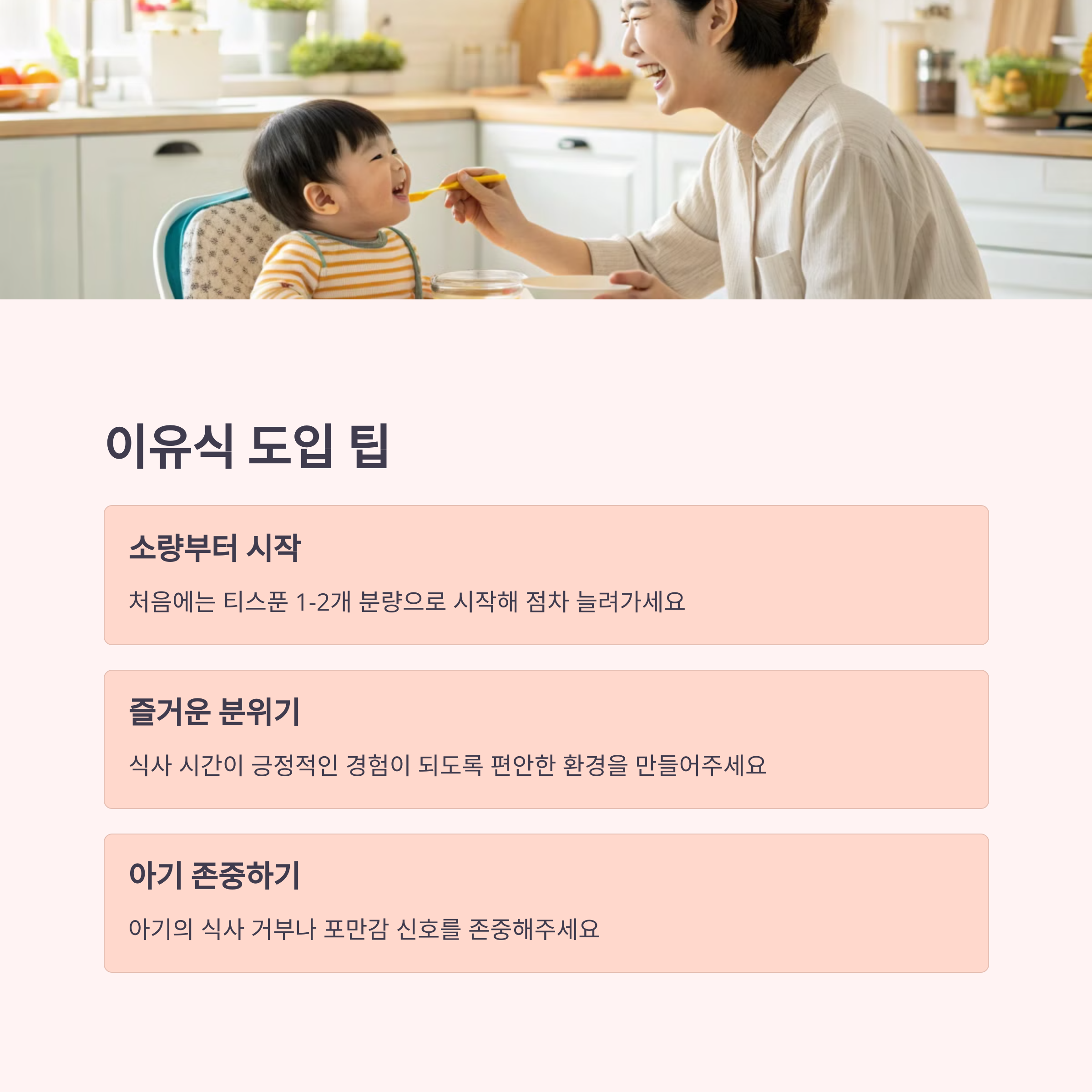 | 하루 1회부터 시작, 점진적 횟수 증가 | 한 가지 재료로 3일 관찰법 적용 | 단계별 이유식 스케줄 참고 필수 |