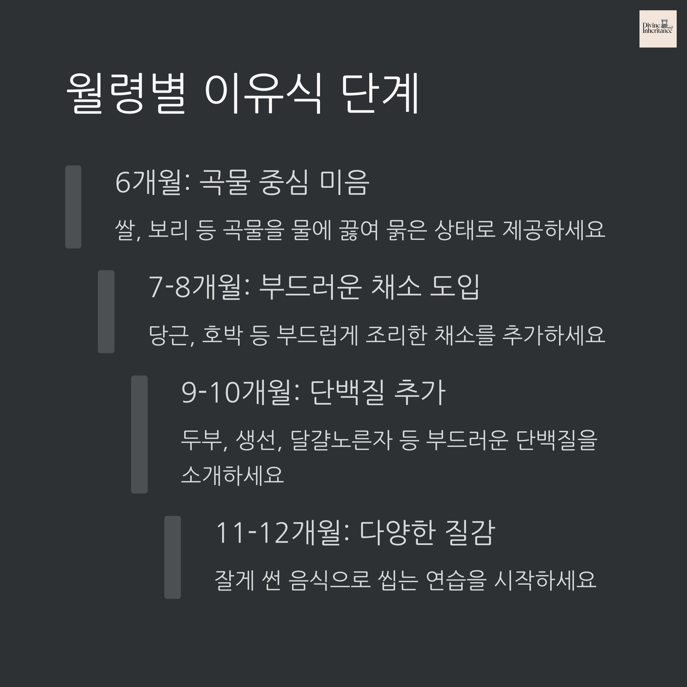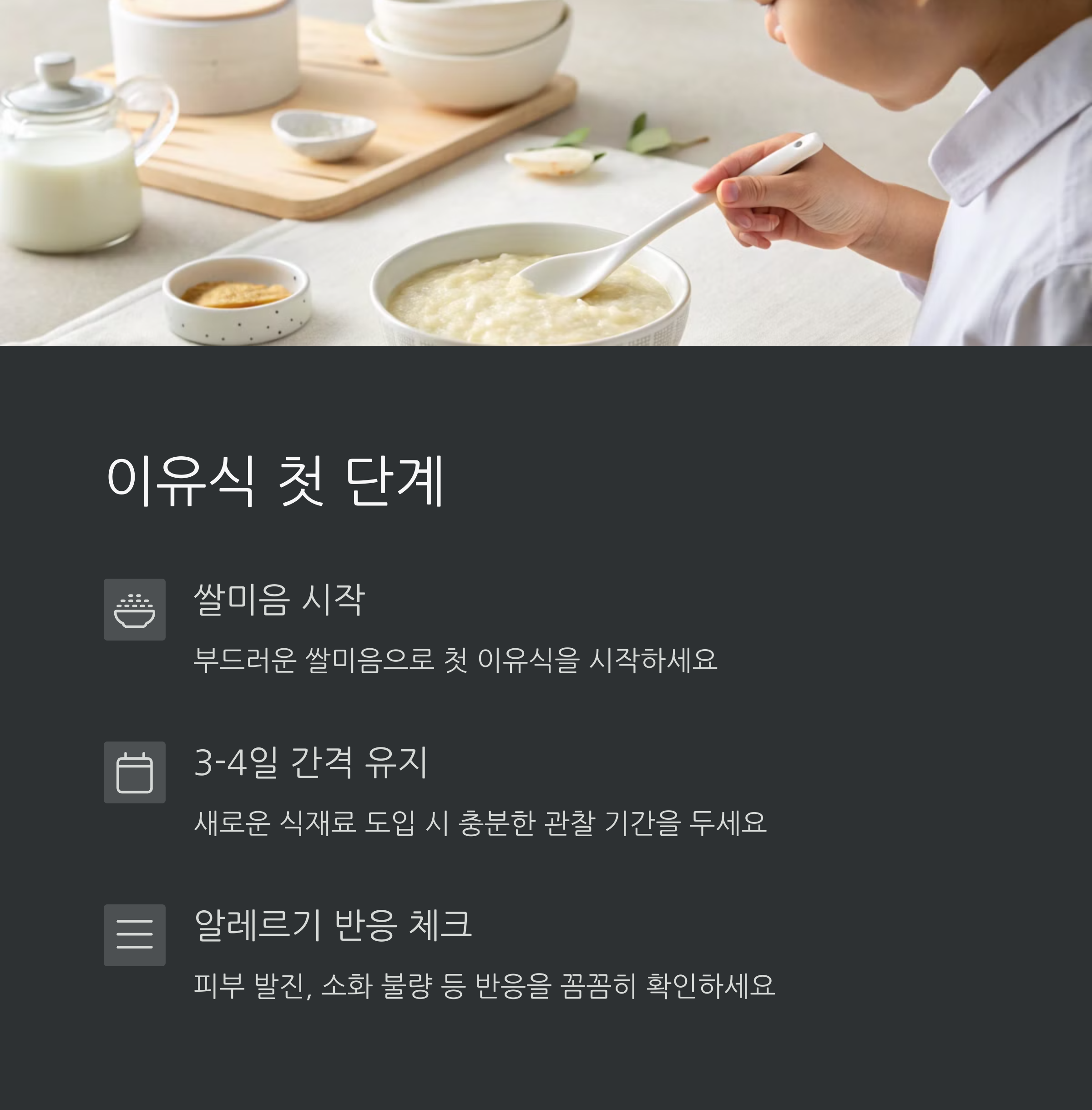 | 이유식 시작 시기 | 생후 5~6개월 사이에 첫 이유식을 시작합니다. |