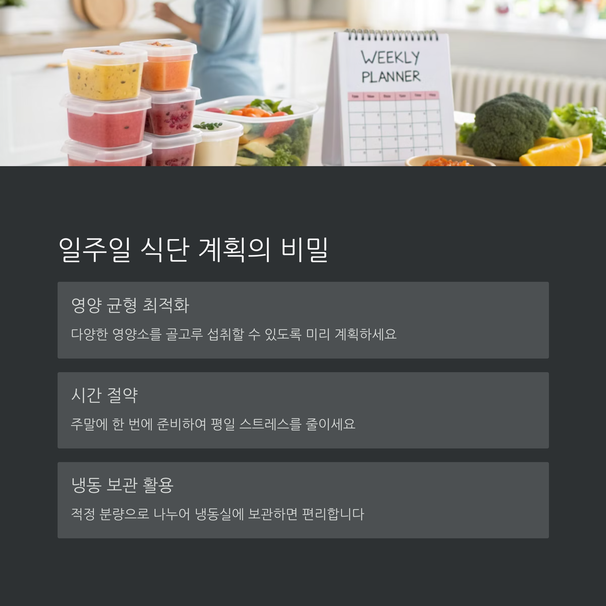 | 알레르기 유무 확인 필수입니다. | 일주일 단위로 식단을 기록해두면 좋습니다. | 간은 하지 않고 식재료 본연의 맛을 살립니다. |
