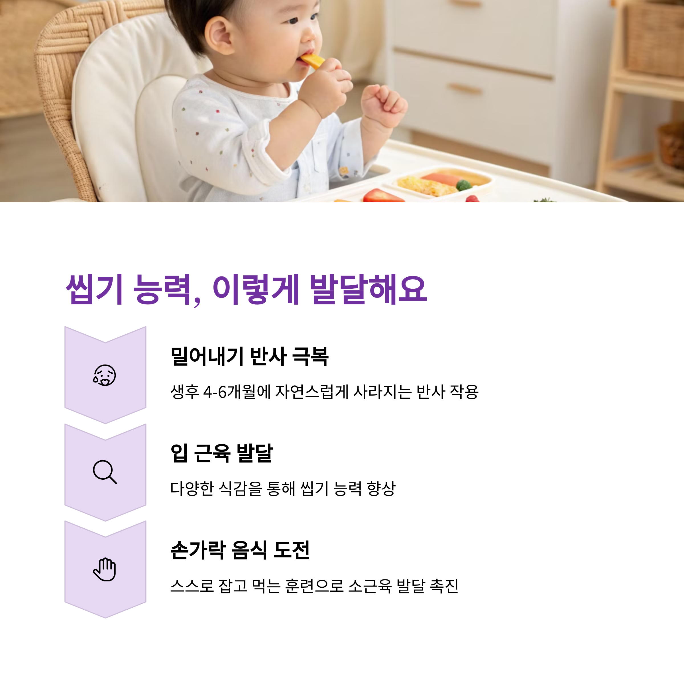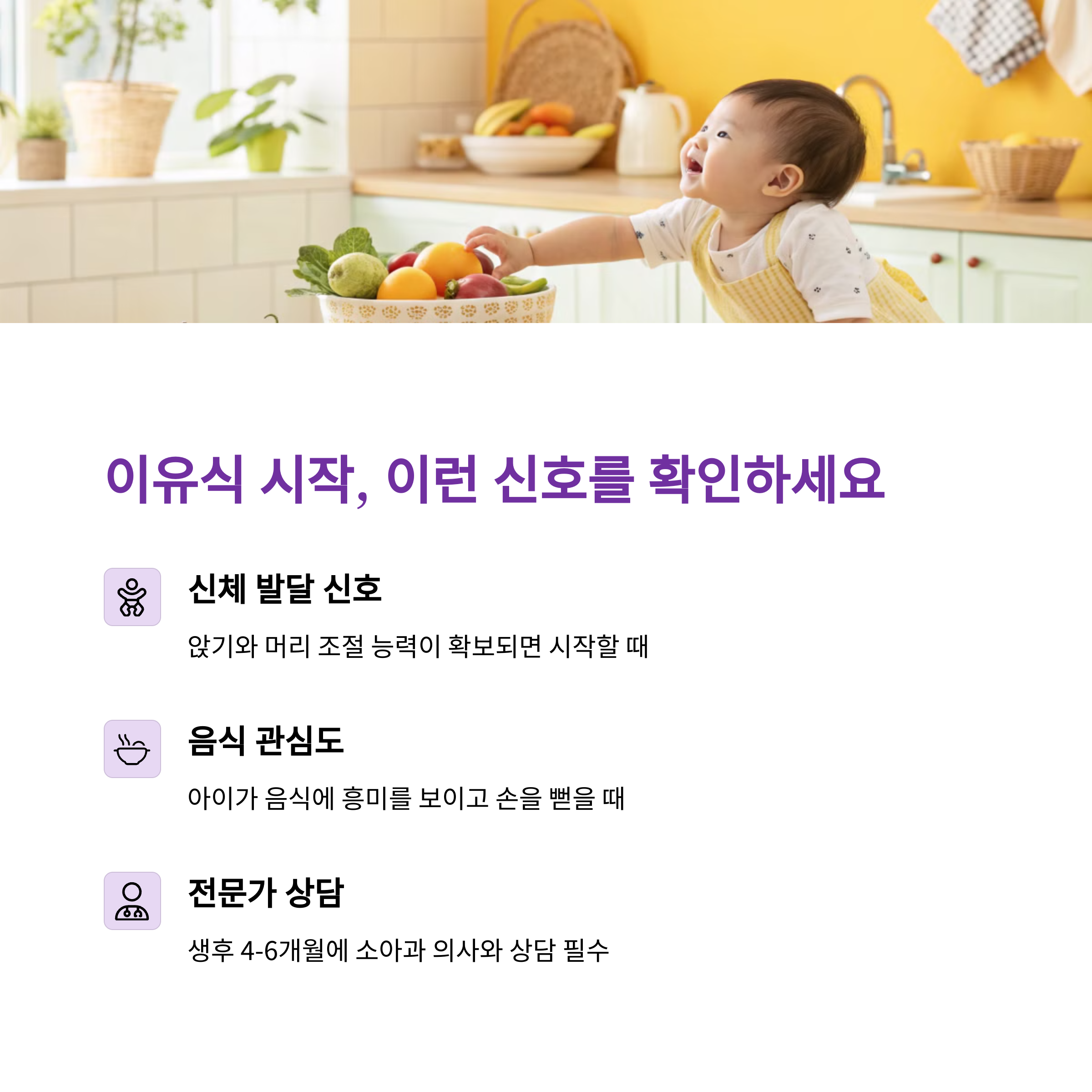 | 유아식 준비 체크리스트 | 소화 능력, 음식 씹기, 식사 리듬이 준비되어야 합니다. |