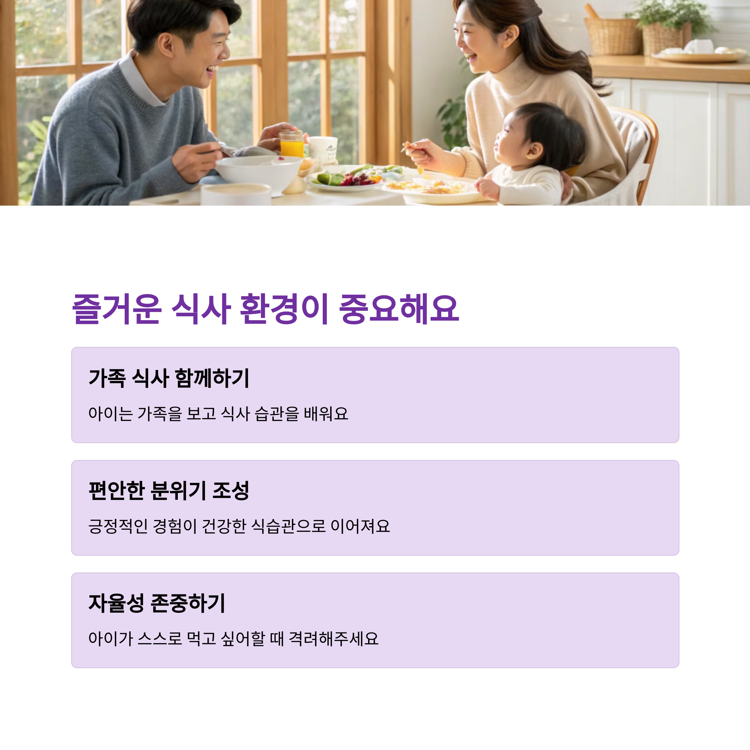 | 생후 12개월~15개월 시점이 적기입니다. | 부드러운 밥, 익힌 채소, 두부, 달걀 등 권장 | 아이의 식사 행동을 세심히 관찰하고 기록하세요. |