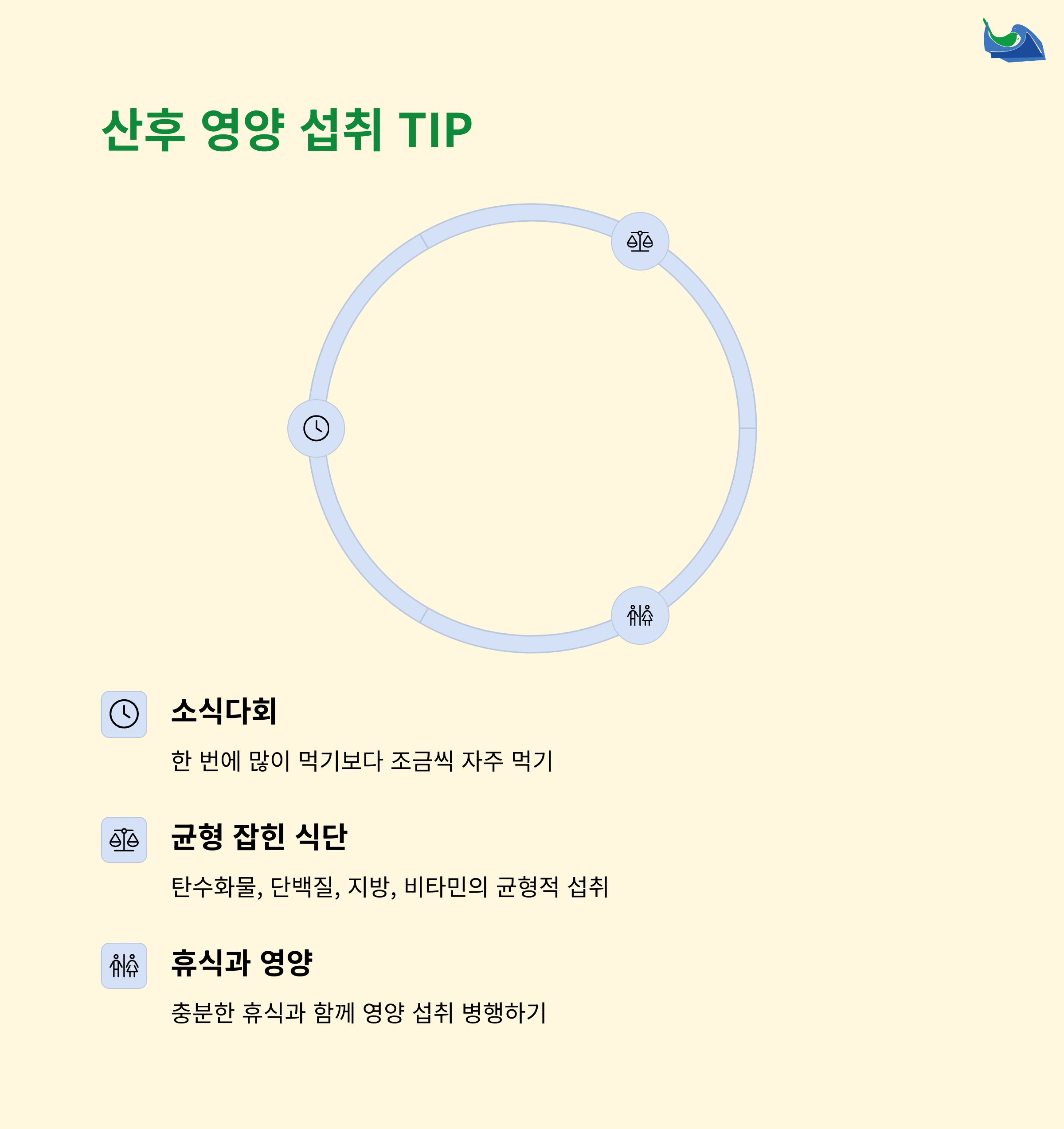 | 산후 체력 회복 식단 | 에너지 보충과 피로 회복에 효과적인 식단 예시입니다. |
