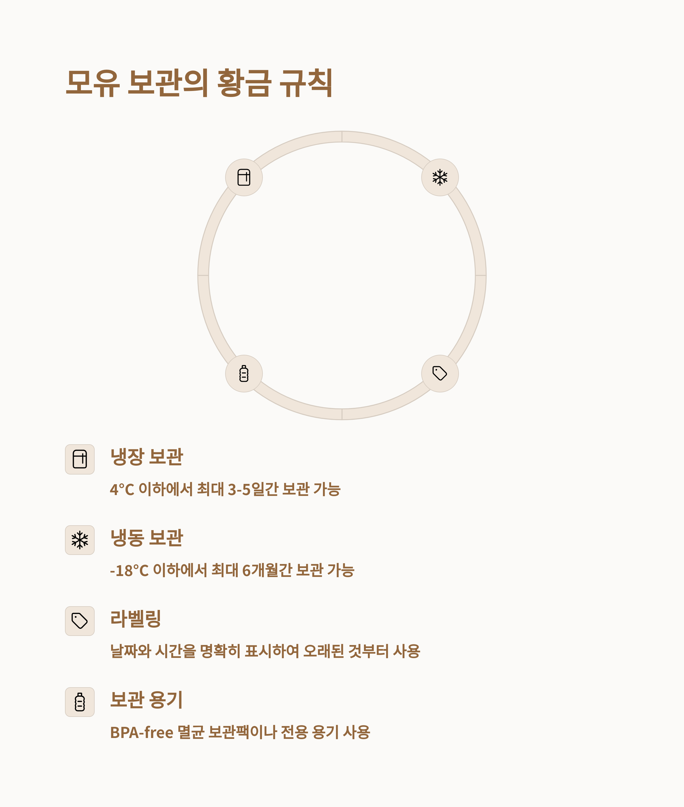 | 수유 직후 또는 아기 잠든 시간대가 적합합니다. | 냉장, 냉동 각각 구분하여 라벨링 필수입니다. | 등받이 기대어 편하게 앉은 자세가 좋아요. |