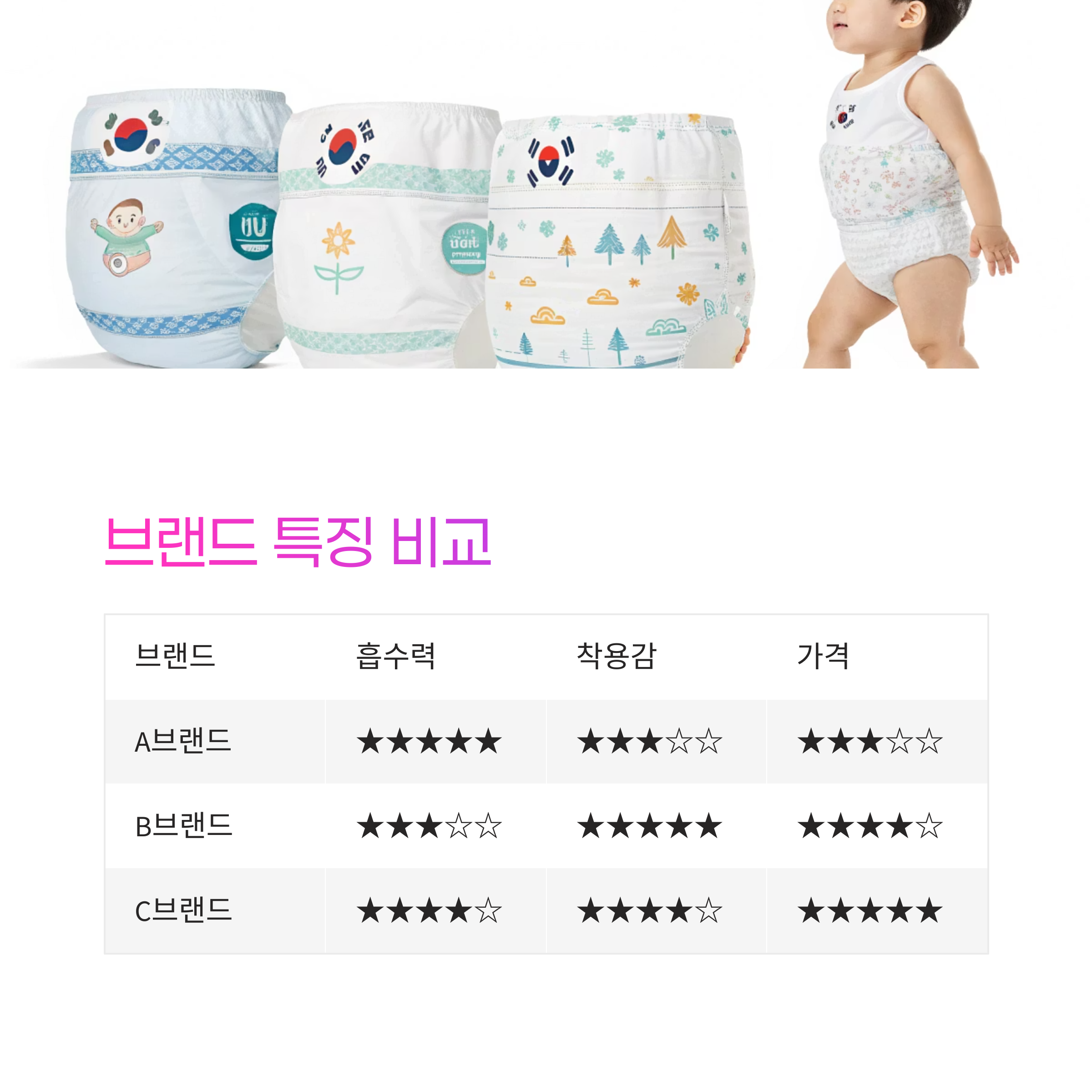 | 흡수력 비교 | 기저귀의 흡수력이 밤새 보송함을 좌우합니다. |