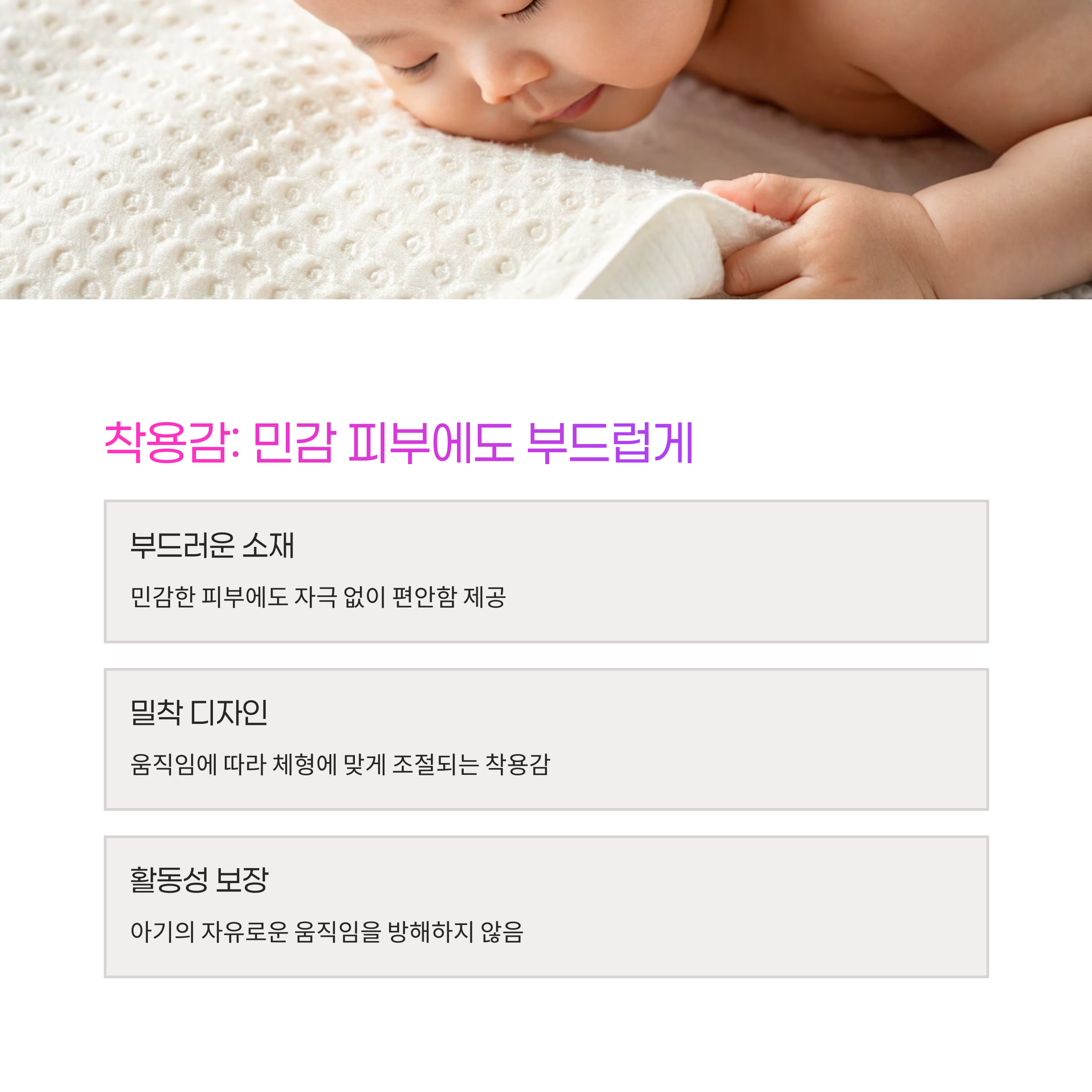 | 착용감 평가 | 아기 피부에 자극 없이 부드럽게 착용되어야 해요. |