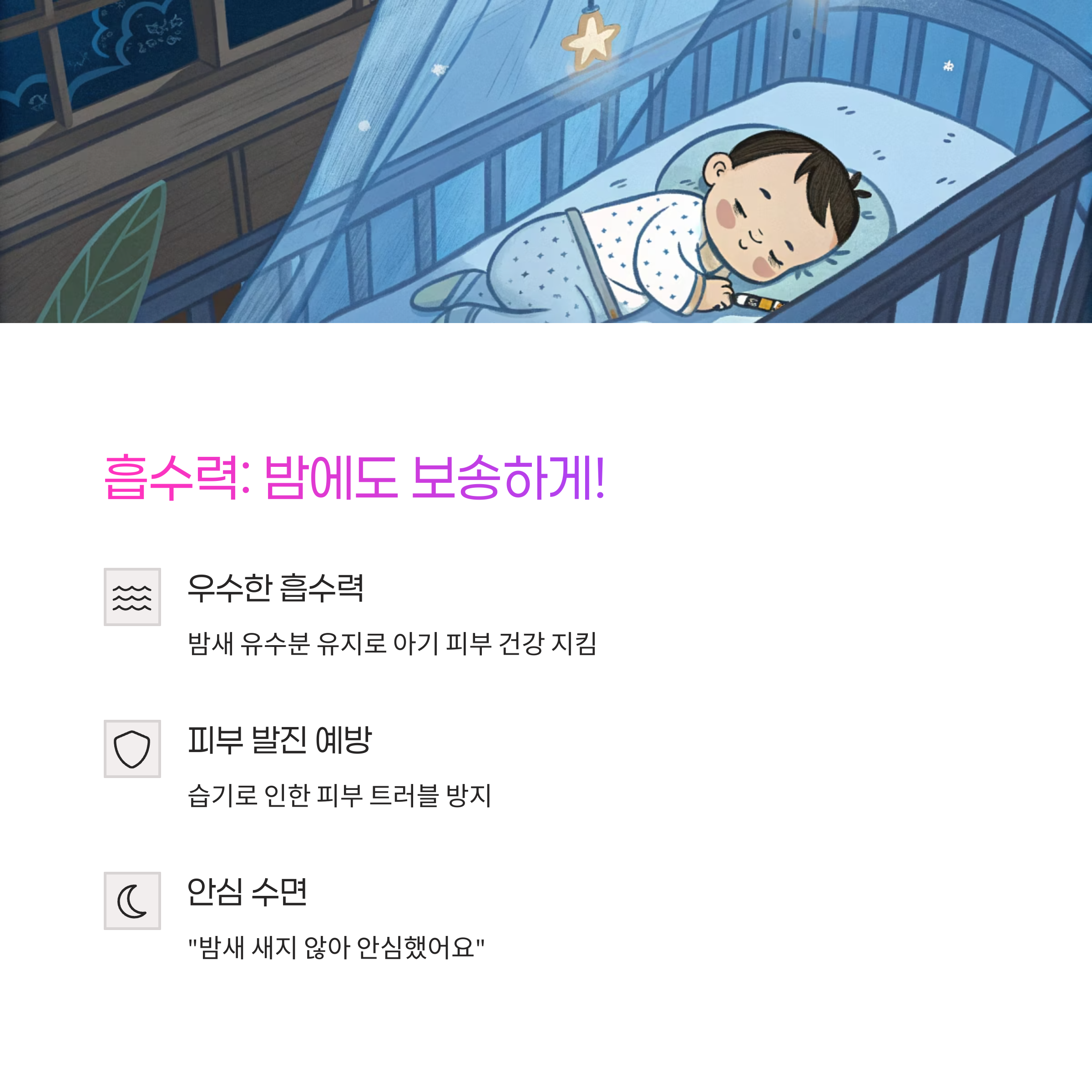 | 밤새 젖지 않는 흡수력 확인 | 민감한 피부에도 안심 사용 가능 | 정기배송, 묶음 구매 시 할인 효과 |