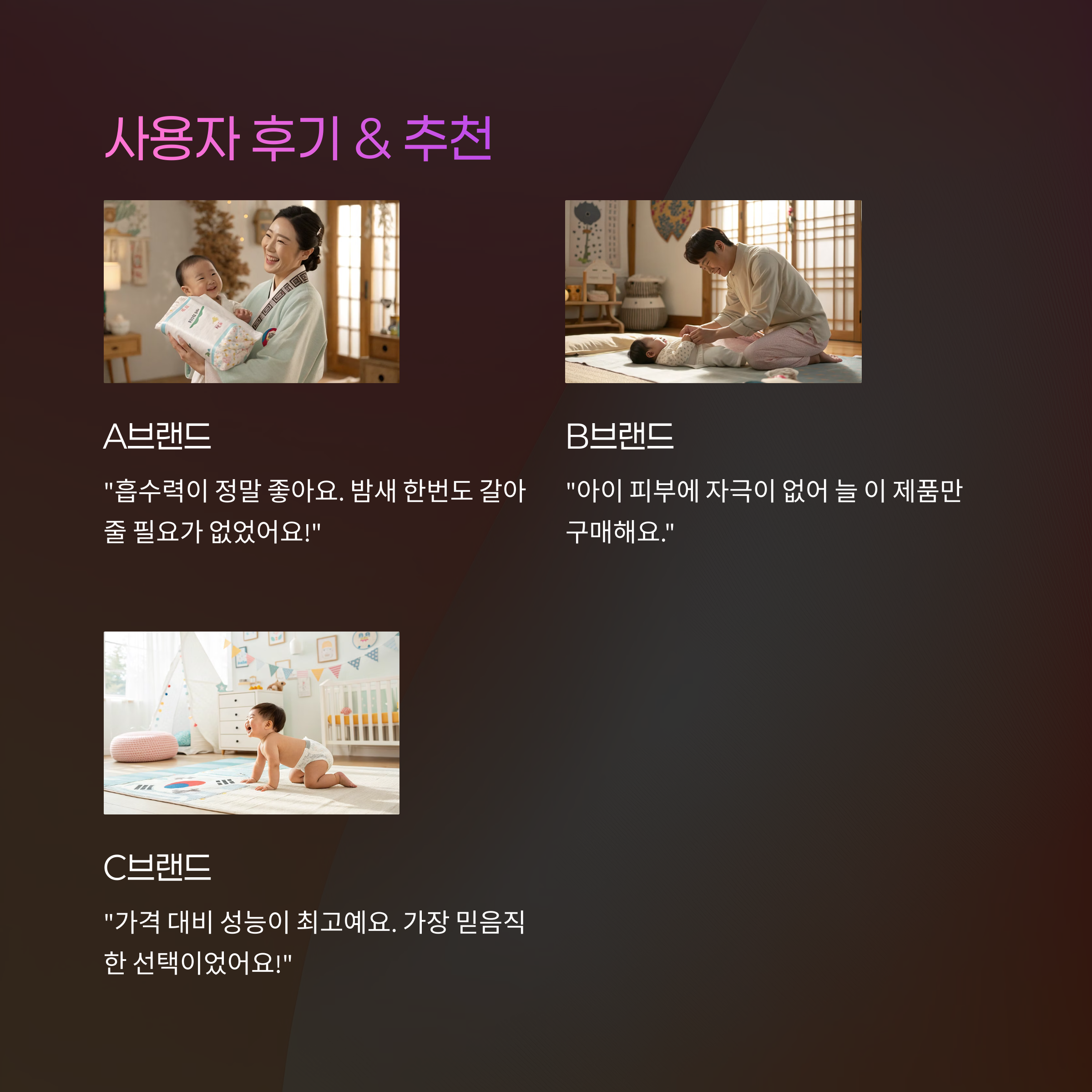 실제 브랜드 선택에 있어선 단순히 광고 문구나 이미지보다 체험단 후기나 블로그 사용기를 확인하는 것이 중요합니다. 기저귀는 하루에도 여러 번 갈아야 하는 소모품이기 때문에 가성비도 무시할 수 없습니다. 대용량 묶음 구성이나 정기배송 옵션이 있는 브랜드는 경제적인 측면에서도 큰 장점이 되죠. 결론적으로는 흡수력, 착용감, 가성비를 모두 만족시키는 브랜드를 찾는 것이 가장 현명한 선택입니다.