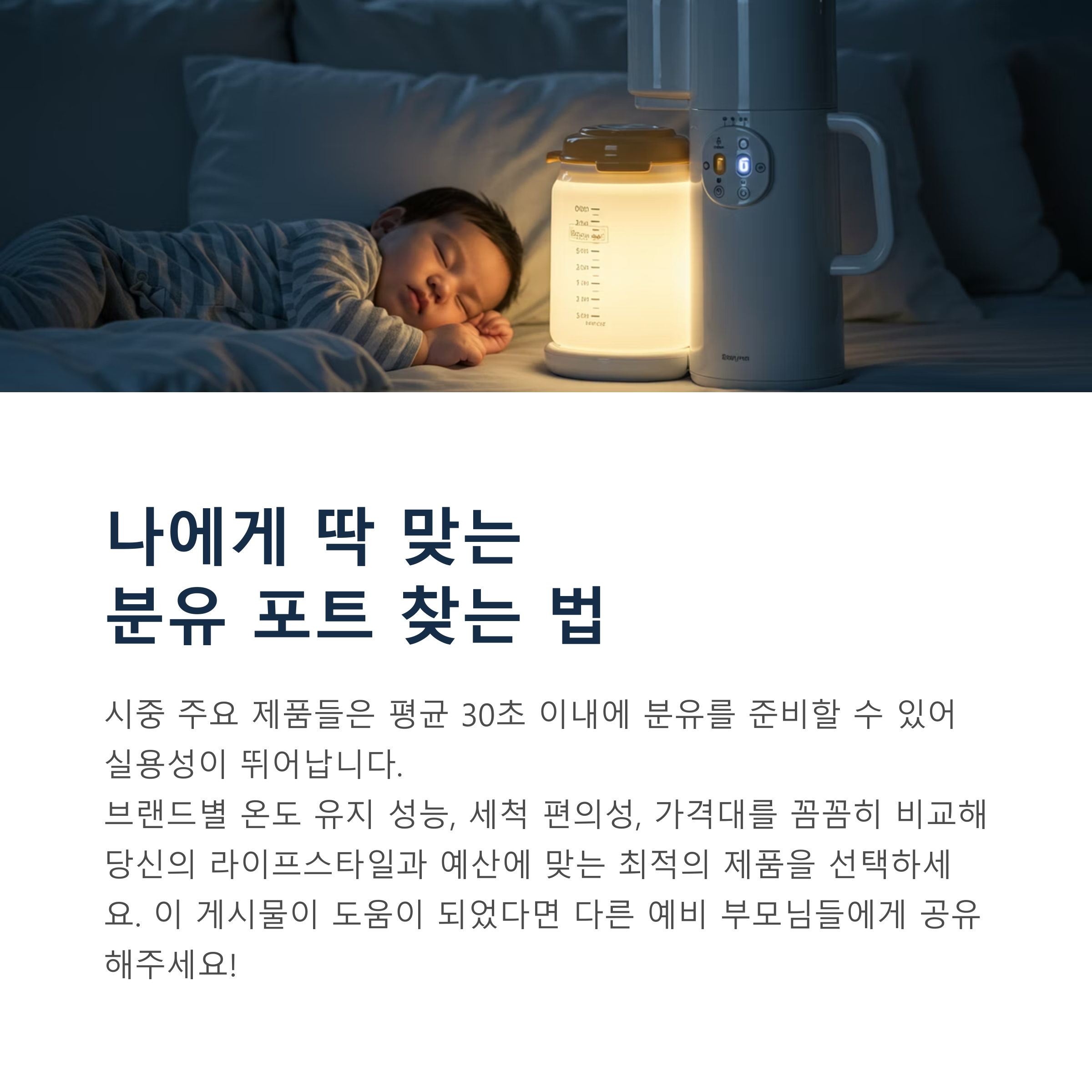 | 밤중 수유 시 빠른 분유 준비에 도움 | 신생아 건강을 위한 필수 조건 | 위생 관리 부담을 덜어주는 기능적 요소 |