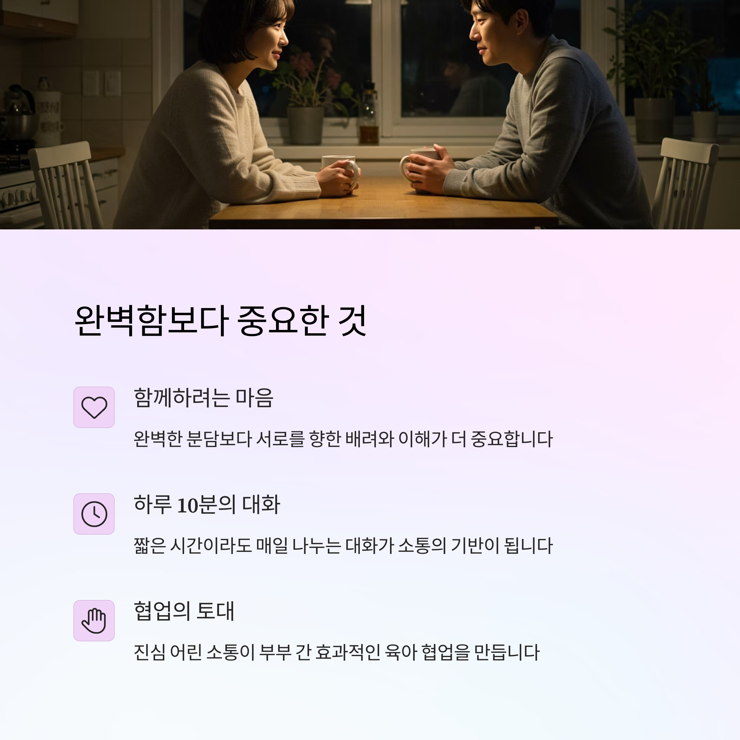 | 구체적이고 현실적인 분담표 작성이 핵심입니다 | 하루 10분이라도 둘만의 대화를 실천해 보세요 | 상대의 입장에서 생각해보는 연습이 필요합니다 |