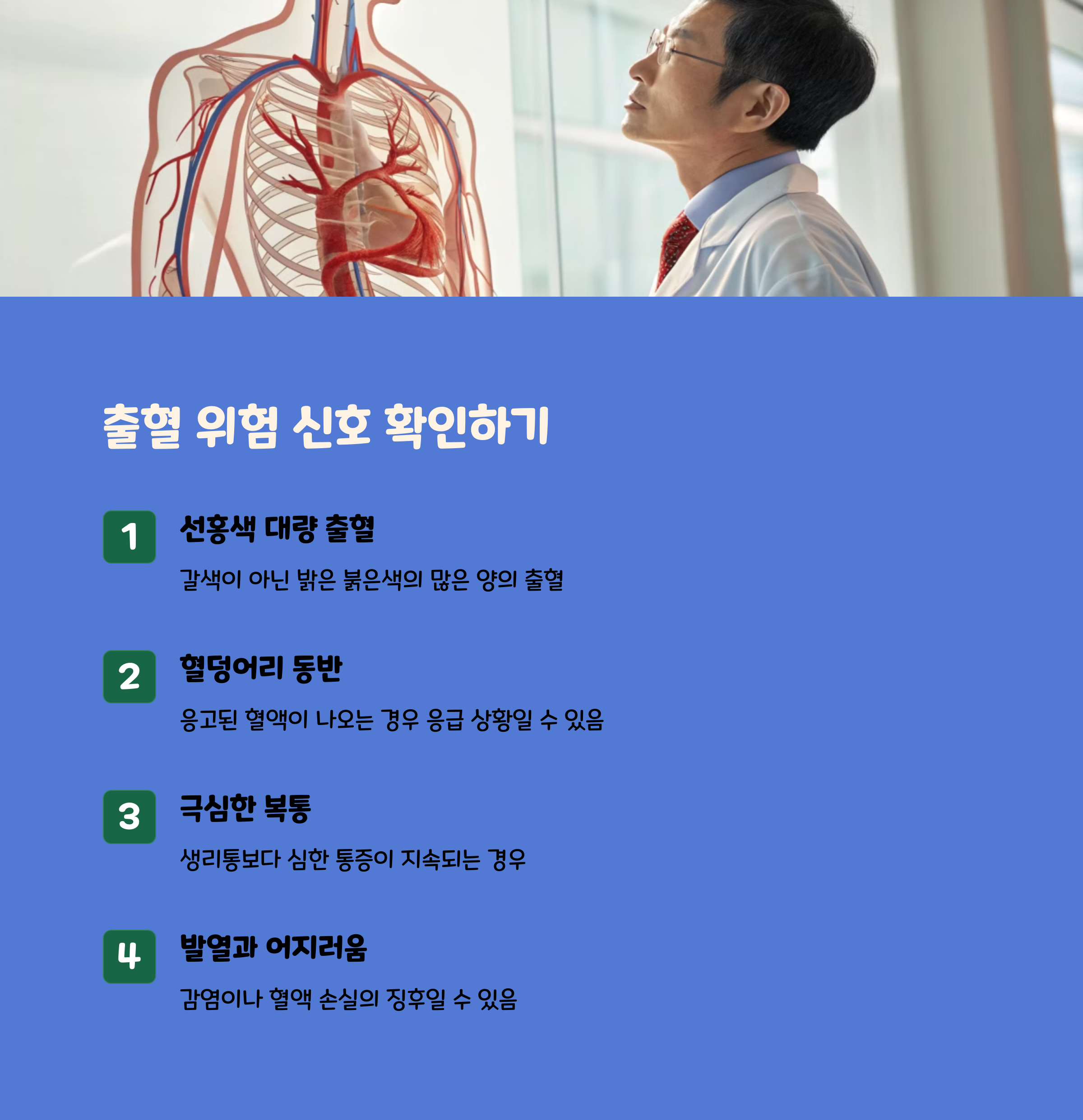 | 갈색 혈, 복통, 피로감 등은 조심해야 해요. | 출혈, 극심한 복통, 어지러움은 즉시 진료 필요. | 정기검진, 휴식, 영양 섭취로 건강을 유지해요. |