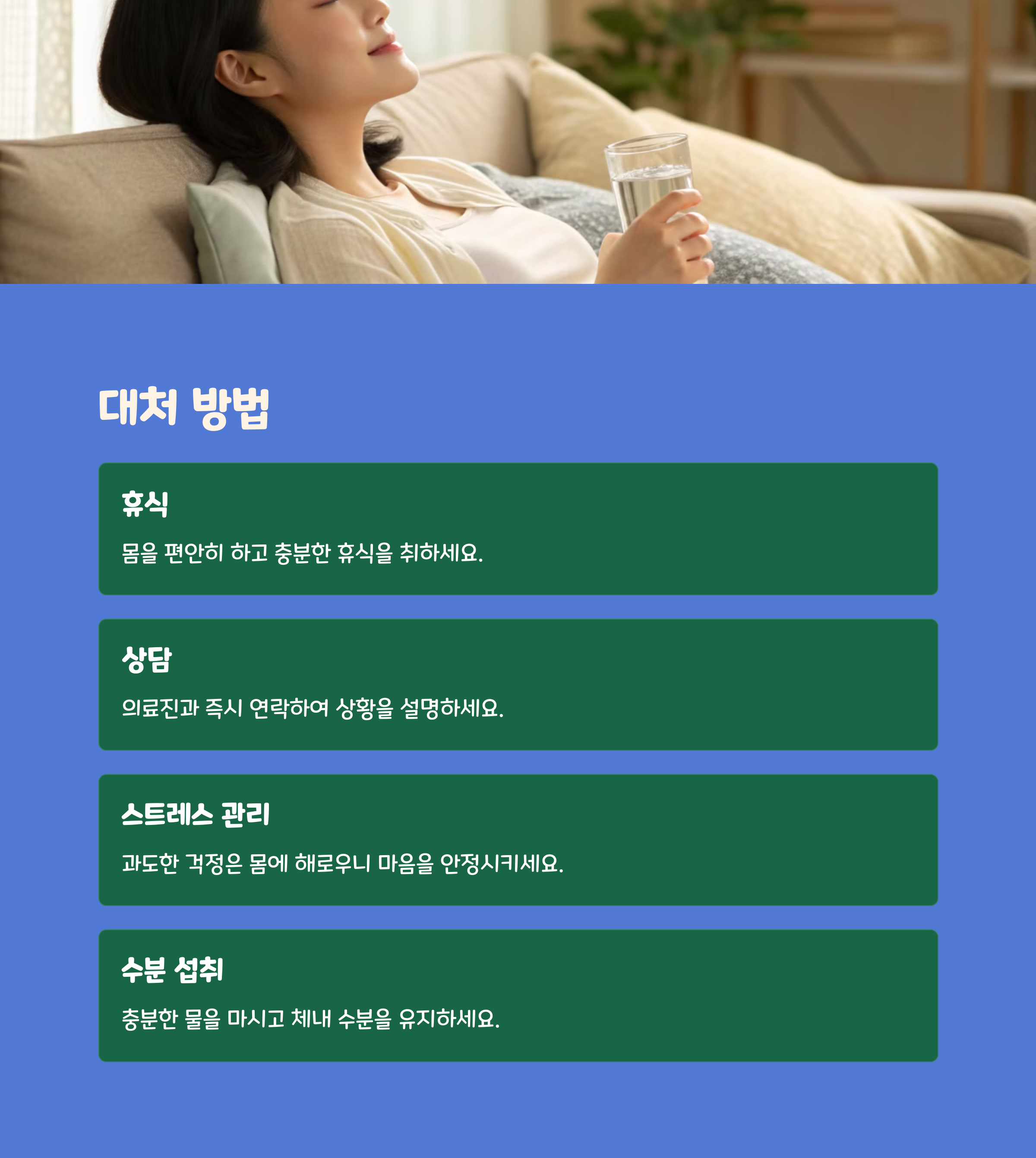 | 신체 이상 시 즉시 병원에 연락하세요. | 통증과 출혈은 주말/야간에도 즉시 진료! | 몸에 무리가 가지 않도록 활동량을 조절하세요. |