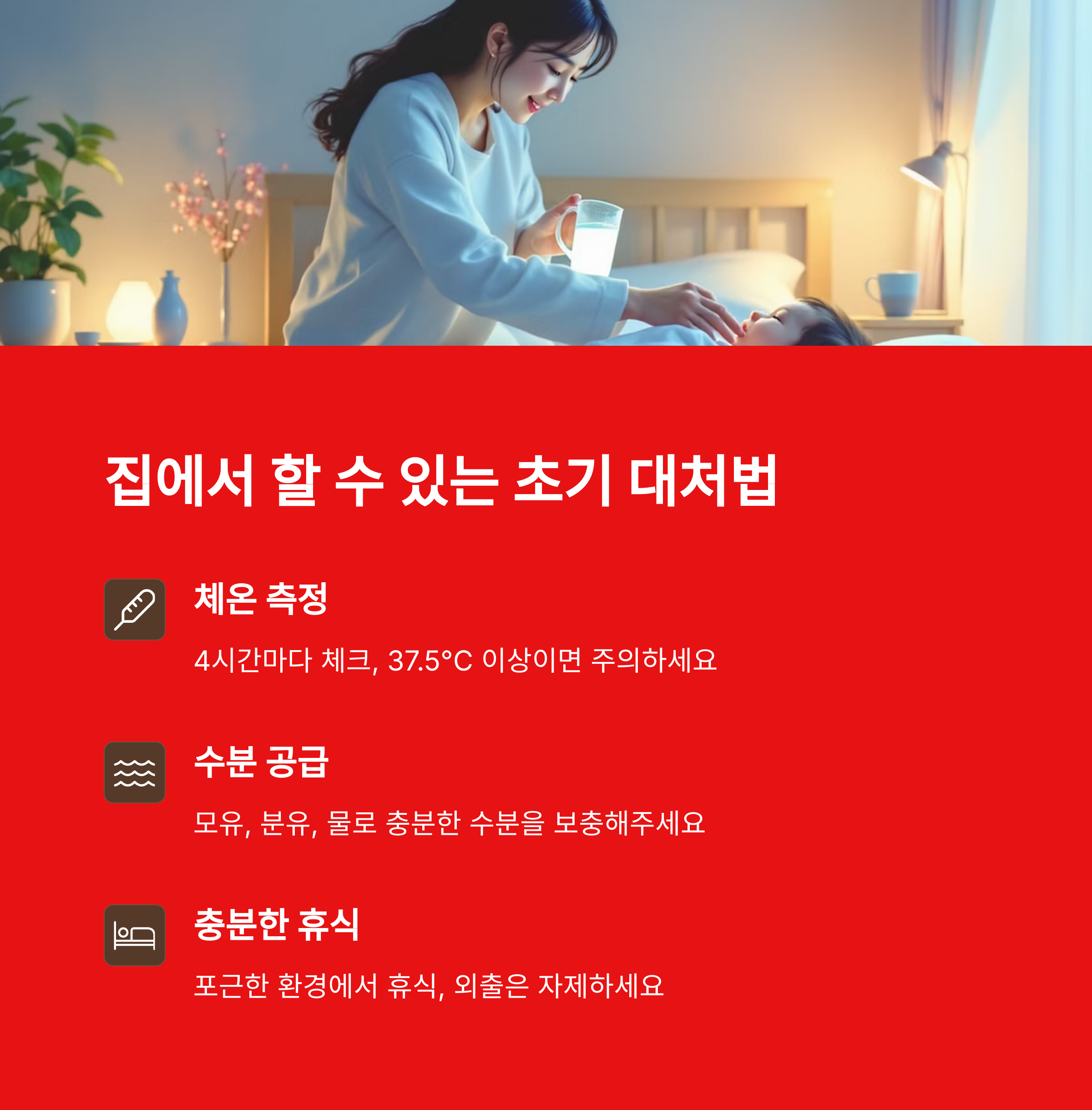 | 콧물, 재채기, 미열, 보채기 등이 주요 증상입니다. | 고열, 기침 지속, 호흡 곤란 시 병원 방문 권장 | 체온 측정, 수분 공급, 상태 관찰로 대응 가능 |