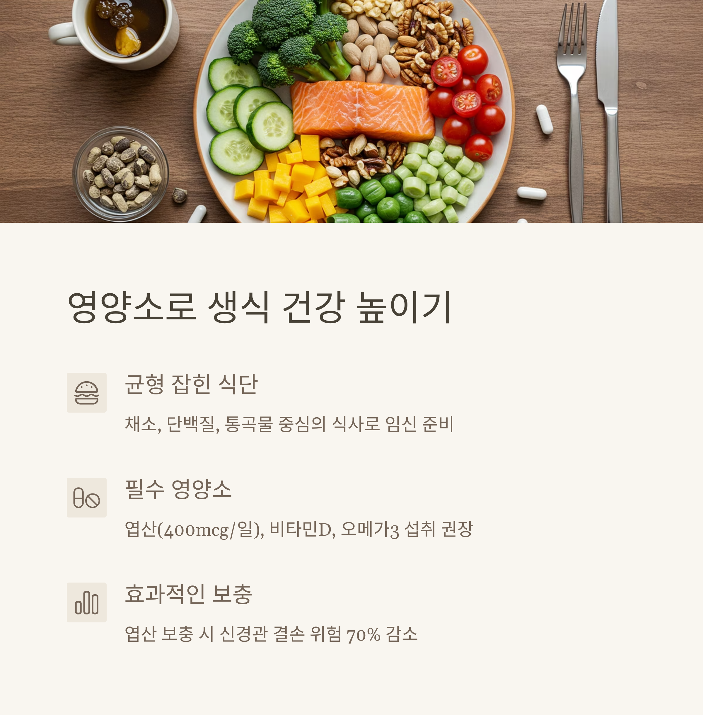 건강한 식습관은 임신 준비에 있어 필수적인 요소입니다. 항산화 성분이 풍부한 채소와 과일, 단백질과 오메가-3 지방산이 풍부한 생선류는 생식 기능을 향상시키는 데 도움을 줍니다. 특히 엽산과 철분, 아연과 같은 미네랄은 임신 전부터 충분히 섭취해야 하며, 비타민 D 역시 착상률을 높이는 데 기여합니다. 커피나 술, 가공식품의 섭취는 줄이고 신선한 자연식 위주의 식단으로 조절하는 것이 좋습니다.