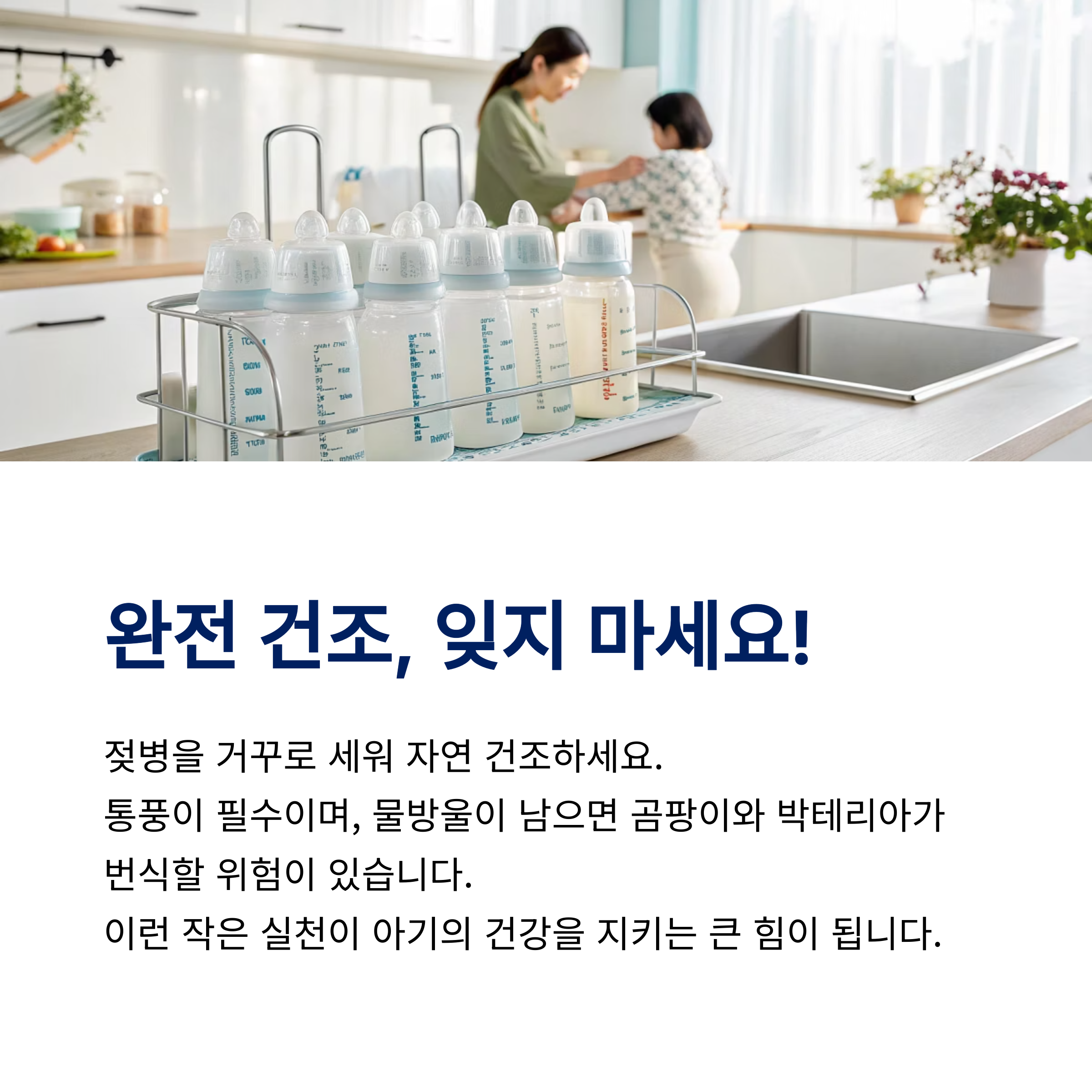 | 보관 전 뜨거운 물로 세척 후 말리기 필수. | 젖병 살균기 이용도 좋은 선택입니다. | 젖병 내부 습기 차단이 가장 중요합니다. |