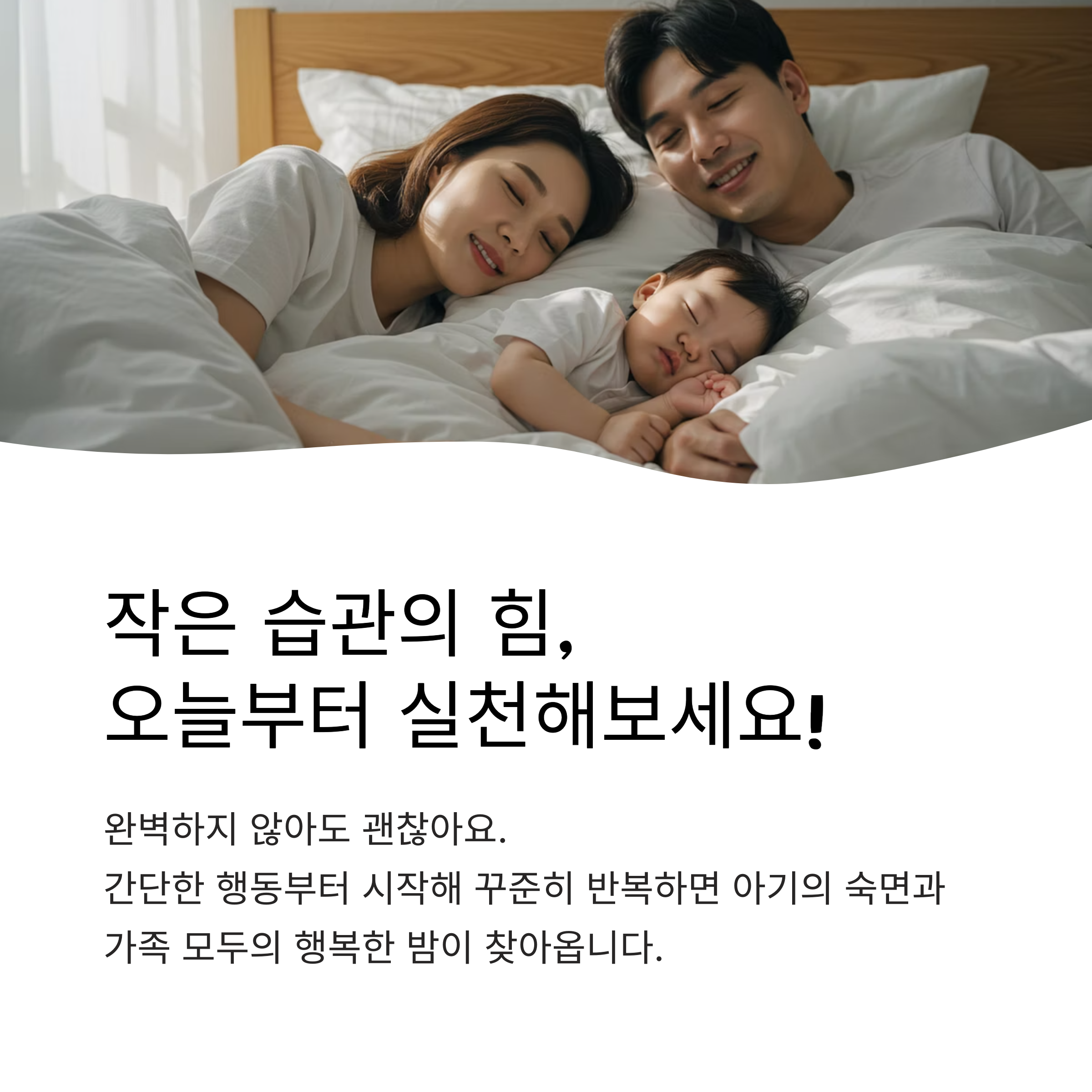 아기의 밤수면 루틴을 만들고 유지하는 과정은 분명 쉽지 않은 여정일 수 있습니다. 하지만 그 노력이 쌓여 아기뿐 아니라 부모 모두의 삶의 질을 높여주는 결과로 이어집니다. 매일 정해진 시간에 따뜻한 분위기 속에서 하루를 마무리하는 습관은 아기에게 큰 안정감을 줄 뿐 아니라, 부모와의 애착 형성에도 매우 중요한 역할을 합니다. 불완전해도 괜찮습니다. 중요한 건 일관성이고, 그 안에서 아기와 함께 성장해나가는 것입니다. 오늘부터 작은 변화 하나씩 시작해보세요. 분명 큰 차이를 느끼게 될 것입니다.