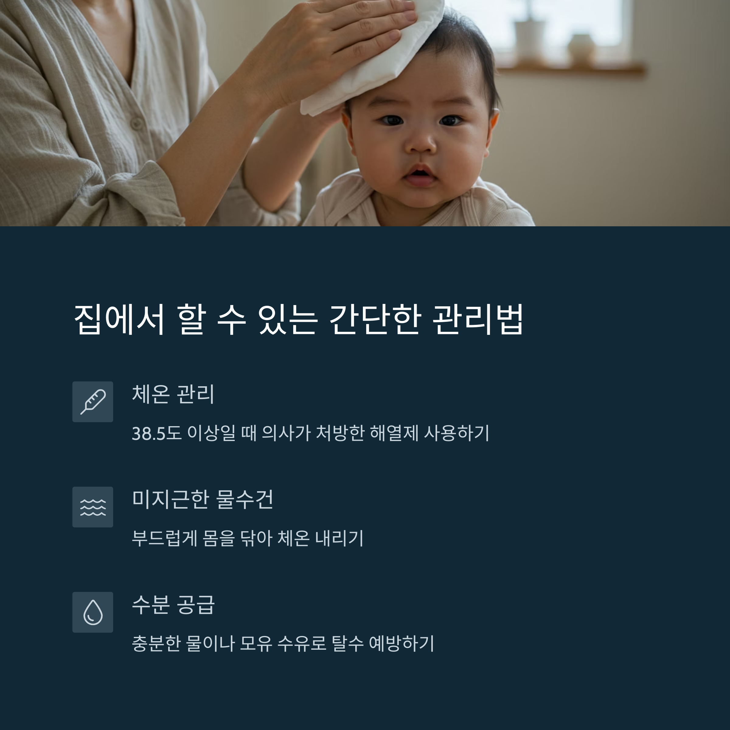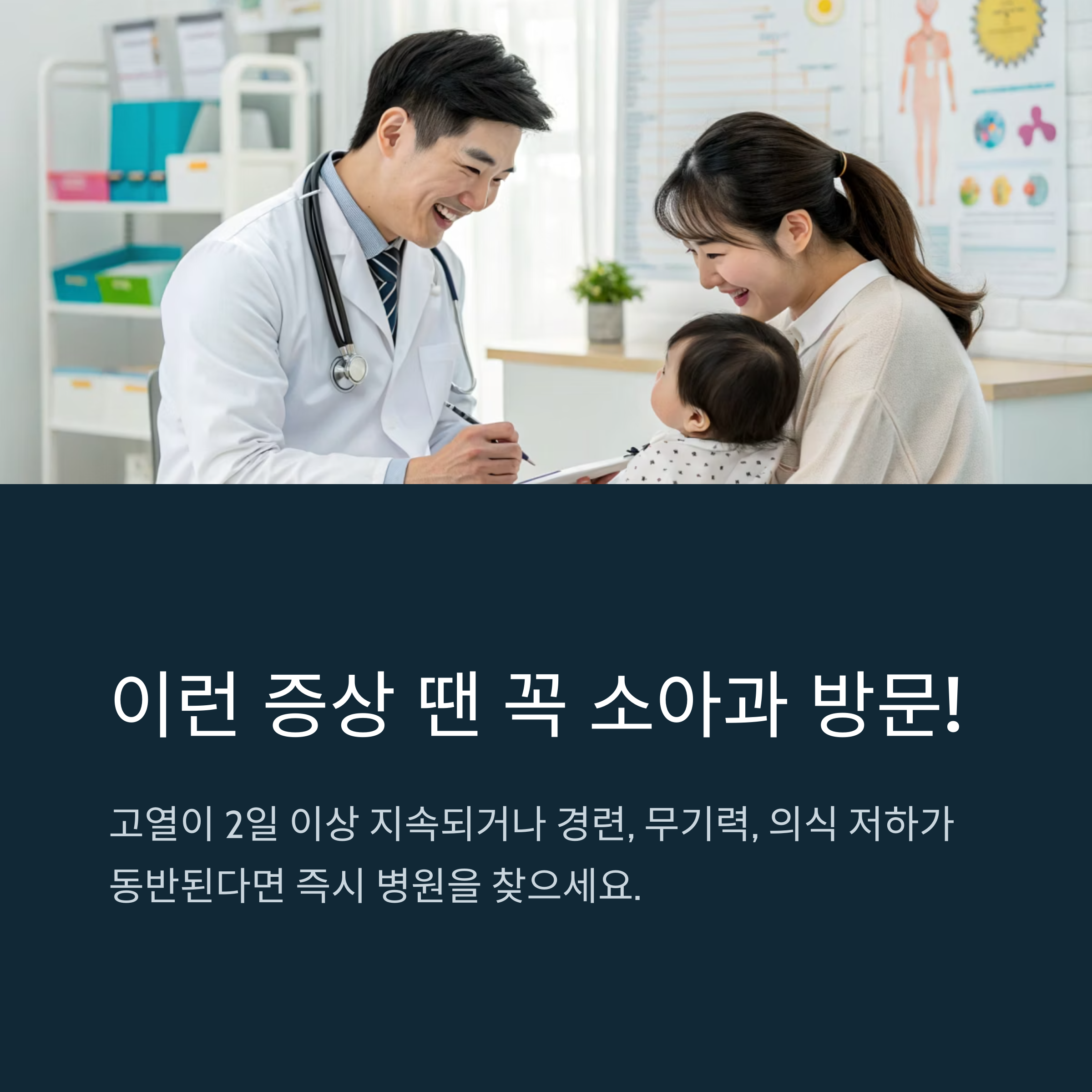 | 언제 병원을 가야 하나요? | 고열이 2일 이상 지속되거나 경련이 동반될 때는 진료가 필요합니다. |