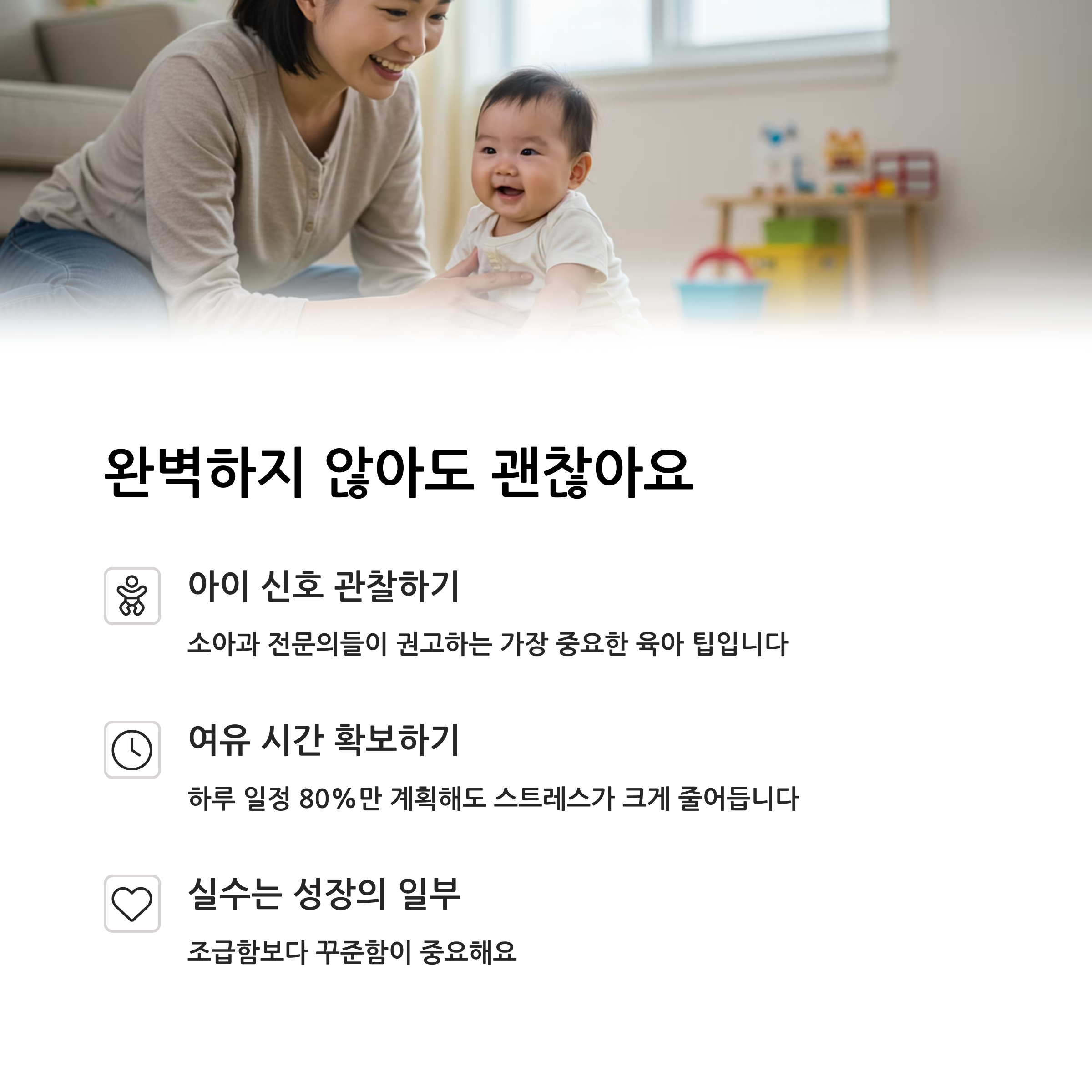 많은 초보맘들이 가장 흔히 하는 실수 중 하나는 모든 정보를 너무 완벽하게 따르려 한다는 점입니다. 책이나 전문가의 조언도 중요하지만, 내 아이의 반응을 가장 먼저 관찰하는 것이 우선이에요. 아이마다 기질과 리듬이 다르기 때문에, 때로는 방법을 유연하게 바꾸는 것이 스트레스를 줄이는 길입니다. 특히 수면 교육이나 이유식은 타이밍보다 분위기가 중요하다는 것을 꼭 기억하세요.