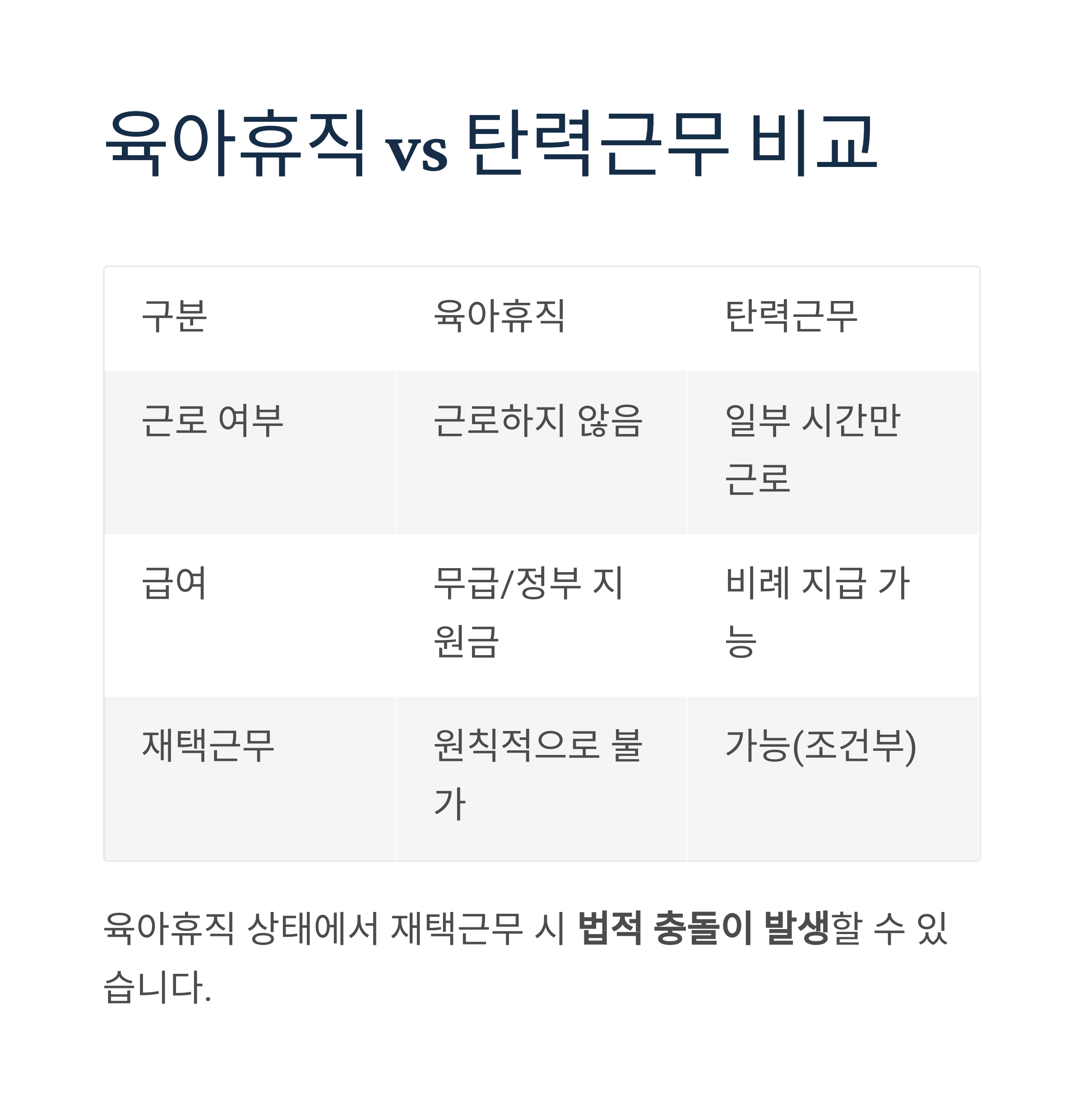 - 육아휴직 중 재택근무는 원칙적으로 불가합니다.