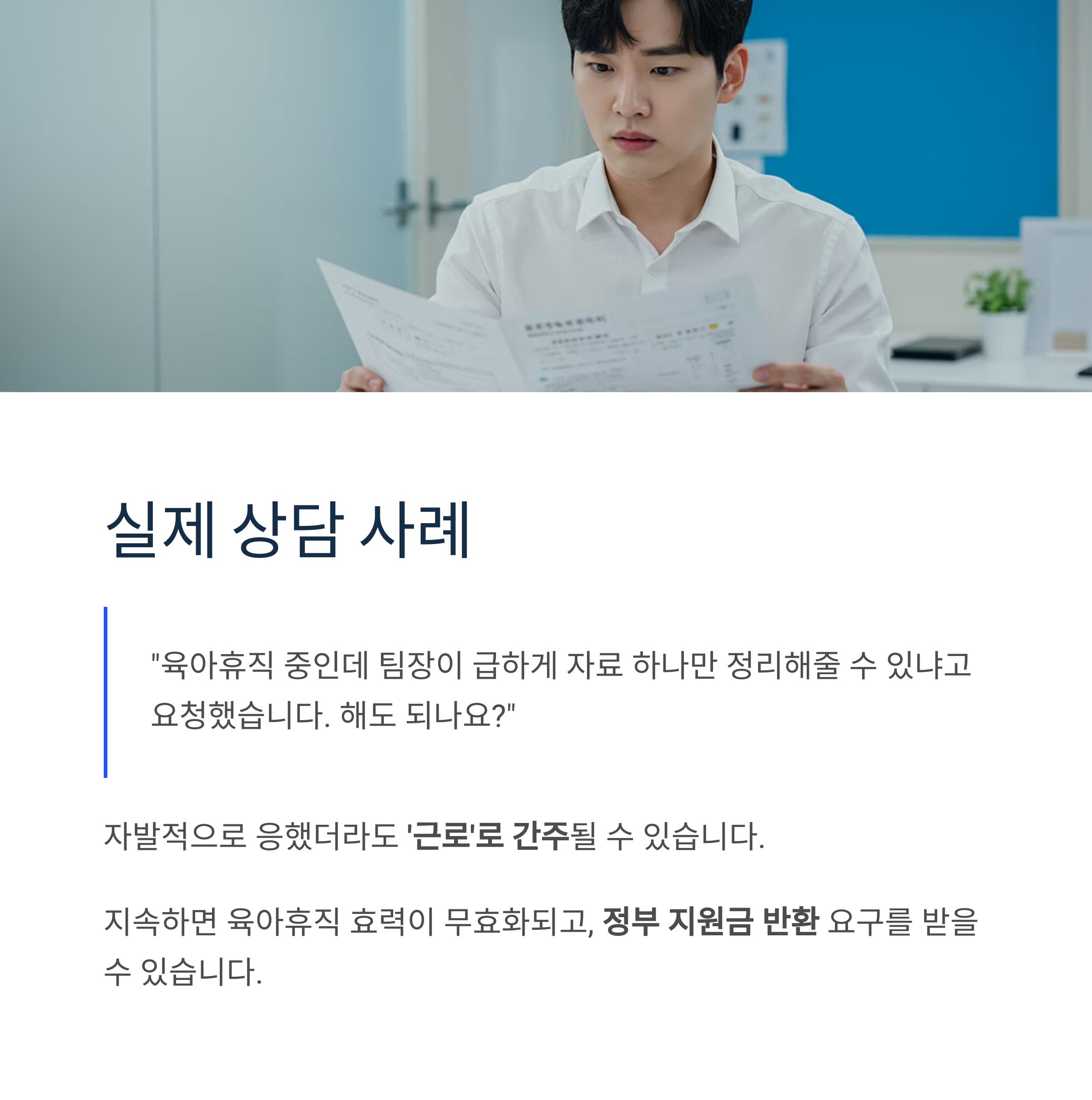 → 이 경우 자발적으로 응했다 하더라도 '근로'로 간주될 여지가 있습니다. 만약 이를 지속하면 육아휴직의 효력이 무효화될 수 있으며, 정부에서 받은 육아휴직 급여를 반환하라는 통지를 받을 수 있습니다.