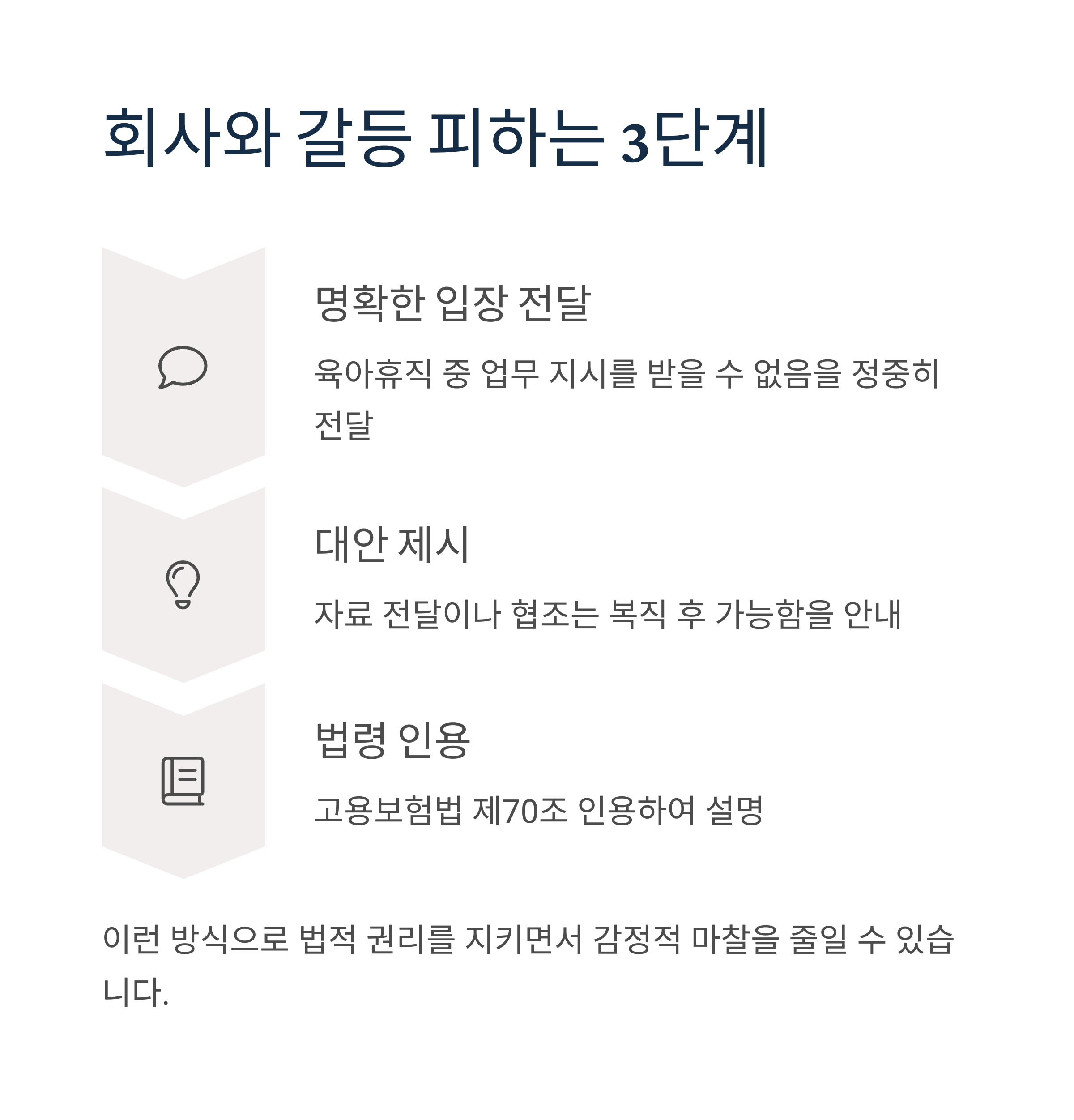 - 육아휴직 중이므로 업무 지시를 받을 수 없다는 점을 정중히 전달합니다.